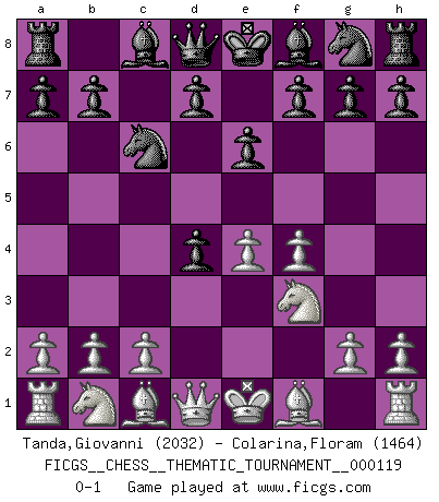 Last move : 0-1 2010 August 31 14:56:29 [Event "FICGS__CHESS__THEMATIC_TOURNAMENT__000119"] [Site "FICGS"] [Date "2010.08.27"] [Round "1"] [White "Tanda,Giovanni"] [Black "Colarina,Floram"] [Result "0-1"] [WhiteElo "2032"] [BlackElo "1464"] 1.e4 c5 2.d4 cxd4 3.f4 Nc6 4.Nf3 e6 0-1 Sicilian : Smith-Morra gambit Player Black won this chess game. Follow this game move after move (download)We like to think. (Gary Kasparov) Später, ... hatte ich zunehmend Erfolg in entscheidenden Partien. Vielleicht weil ich eine einfache Wahrheit erkannte: nicht nur ich hatte Angst, auch mein Gegner. (Mikhail Nekhemyevich Tal) Tu puedes aprender mucho mas de una partida que pierdas que de una partida ganada. Tendras que perder cientos de partidas antes de llegar a ser un buen jugador. (Jose Raul Capablanca) Des combinaisons [dans le jeu d'échecs] pareilles à des mélodies. Je crois entendre pour ainsi dire la musique des coups... (Vladimir Nabokov) Lottery : A tax on people who are bad at math. (Author unknown)