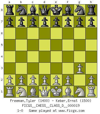 Last move : 1-0 2007 January 8 5:1:48 [Event "FICGS__CHESS__CLASS_D__000019"] [Site "FICGS"] [Date "2006.11.18"] [Round "1"] [White "Freeman,Tyler"] [Black "Keber,Ernst"] [Result "1-0"] [WhiteElo "1400"] [BlackElo "1500"] 1.g3 1-0 This chess game has been lost on time (started : 2006.11.18 14:12:55) Benko's Opening Player White won this chess game. Follow this game move after move (download)I have always a slight feeling of pity for the man who has no knowledge of Chess. (Siegbert Tarrasch) Jeder Schachmeister war einmal ein Anfänger. (Irving Chernev) Nunca nadie ha ganado una partida de Ajedrez rindiendose. (Unknown) La solitude du joueur d'Echecs à l'approche du mat est semblable à celle du condamné. (Francis Szpiner) All men can see these tactics whereby I conquer, but what none can see is the strategy out of which victory is evolved. (Sun Tzu)