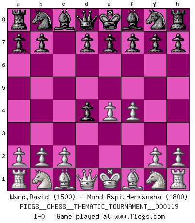 Last move : 1-0 2010 October 6 9:19:7 [Event "FICGS__CHESS__THEMATIC_TOURNAMENT__000119"] [Site "FICGS"] [Date "2010.08.27"] [Round "1"] [White "Ward,David"] [Black "Mohd Rapi,Herwansha"] [Result "1-0"] [WhiteElo "1500"] [BlackElo "1800"] 1.e4 c5 2.d4 cxd4 3.f4 1-0 This chess game has been lost on time (started : 2010.08.27 2:33:38) Sicilian : Smith-Morra gambit Player White won this chess game. Follow this game move after move (download)Who is your opponent tonight, tonight I am playing against the Black pieces. (Akiba Rubinstein) Bogoljubow: Matt in vier Zügen! Tartakower: Ich verbitte mir jede Belästigung! (Savielly Grigorievitsch Tartakower) El Ajedrez es tortura mental. (Garry Kasparov) Les échecs sont plus proches de l'art de l'assassinat que de l'art de la guerre. (Arturo Perez-Reverte) I live to kill Traxler counterattack. (Ilmars Cirulis)