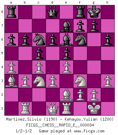 Last move : 1/2-1/2 2010 September 11 2:1:56 [Event "FICGS__CHESS__RAPID_E__000034"] [Site "FICGS"] [Date "2010.08.28"] [Round "1"] [White "Martinez,Silvio"] [Black "Kehayov,Yulian"] [Result "1/2-1/2"] [WhiteElo "1190"] [BlackElo "1200"] 1.e4 c5 2.c4 e5 3.Nf3 Nc6 4.Nc3 Nf6 5.Be2 Ne7 6.O-O a6 7.d3 Nc6 8.b3 Be7 9.a4 O-O 10.h3 d6 11.Ba3 h6 12.Re1 Be6 13.Rb1 b6 1/2-1/2 Sicilian defense Kingside Castling by player White (move 6) Kingside Castling by player Black (move 9) This chess game ended in a draw. Follow this game move after move (download)Chess is like war on a board. (Bobby Fischer) Ich kämpfe solange mein Gegner einen Fehler machen kann. (Emanuel Lasker) El Ajedrez es el gimnasio de la mente. (Blaise Pascal) C'est une question de caractère, Beaucoup de gens perdent leur motivation très vite. D'autres, ils sont rares, peuvent la conserver très longtemps. J'aime les échecs, encore aujourd'hui je suis heureux d'analyser des parties. J'aime toujours gagner, je déteste encore perdre. Bien jouer est important pour mon intégrité intellectuelle et morale. Et puis les échecs vivent en ce moment une période historique grâce à Internet. Ils se développent dans les systèmes éducatifs à travers le monde. Ils sortent de leur ghetto, et c'est mon rôle de mener à bien cette révolution. (Gary Kasparov) The human is the only animal species whose members are able to talk themselves into difficulties that would not otherwise exist. (Wendell Johnson)