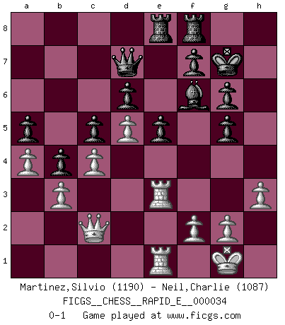 Last move : 0-1 2010 November 27 10:48:45 [Event "FICGS__CHESS__RAPID_E__000034"] [Site "FICGS"] [Date "2010.08.28"] [Round "1"] [White "Martinez,Silvio"] [Black "Neil,Charlie"] [Result "0-1"] [WhiteElo "1190"] [BlackElo "1087"] 1.e4 e5 2.Nf3 Nf6 3.Nc3 d6 4.Bc4 c6 5.d4 Nbd7 6.O-O b5 7.Bb3 a5 8.a4 b4 9.Ne2 Be7 10.c4 Qc7 11.d5 Nxe4 12.h3 O-O 13.Bc2 c5 14.b3 Ndf6 15.Bg5 Nxg5 16.Nxg5 h6 17.Qd3 hxg5 18.Ng3 Bd7 19.Nh5 g6 20.Nxf6+ Bxf6 21.Rfe1 Rae8 22.Re3 Bf5 23.Qe2 Bxc2 24.Qxc2 Kg7 25.Rae1 Qd7 0-1 This chess game has been lost on time (started : 2010.08.28 21:8:9) Petrov Three knights game Kingside Castling by player White (move 6) Kingside Castling by player Black (move 12) Player Black won this chess game. Follow this game move after move (download)I guess a certain amount of temperament is expected of Chess geniuses. (Ron Gross) Mit sehr nachdenklichem Gesicht schreitet Bobby durch den Turniersaal. Was ist passiert?, fragt Lombardy. Ich stehe schlecht, antwortet Fischer. Lombardy: Dann biete doch einfach Remis an. Fischer: So schlecht stehe ich nun auch wieder nicht! (Robert James Fischer) Cuando le juegas a Fischer, no es una cuestion de si vas a ganar o perder. Es una cuestion de si vas a sobrevivir. (Boris Spassky) J'apprécie les joueurs d'est-indienne, c'est grâce à eux que je nourris ma famille depuis tant d'années. (Petrosian) Never risk one's whole fortune unless supported by one's entire army. (Niccolo Machiavelli)