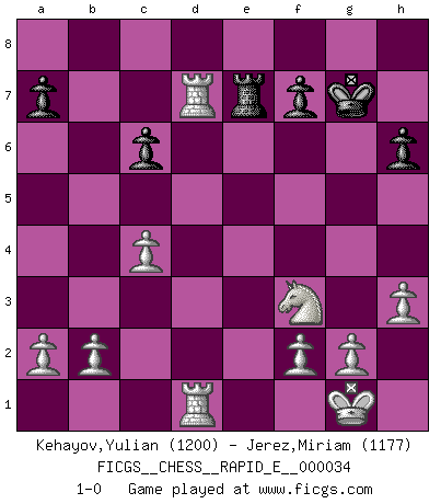 Last move : 1-0 2010 October 8 3:0:41 [Event "FICGS__CHESS__RAPID_E__000034"] [Site "FICGS"] [Date "2010.08.28"] [Round "1"] [White "Kehayov,Yulian"] [Black "Jerez,Miriam"] [Result "1-0"] [WhiteElo "1200"] [BlackElo "1177"] 1.e4 e5 2.Nf3 Nc6 3.d4 d5 4.exd5 Qxd5 5.Be3 Bg4 6.Be2 Bb4+ 7.c3 Bxf3 8.Bxf3 Qd6 9.O-O exd4 10.Bxc6+ bxc6 11.Bxd4 Bc5 12.Bxg7 Qxd1 13.Rxd1 Nf6 14.Bxh8 Nd5 15.Bd4 Bxd4 16.Rxd4 Rd8 17.Nd2 Kf8 18.c4 c5 19.Rxd5 Re8 20.Rxc5 Re7 21.h3 Rd7 22.Rd5 Re7 23.Nf3 c6 24.Rd8+ Kg7 25.Rad1 h6 26.R8d7 1-0 Scotch Opening Kingside Castling by player White (move 9) Player White won this chess game. Follow this game move after move (download)A thorough understanding of the typical mating continuations makes the most complicated sacrificial combinations leading up to them not only not difficult, but almost a matter of course. (Siegbert Tarrasch) Bogoljubow: Matt in vier Zügen! Tartakower: Ich verbitte mir jede Belästigung! (Savielly Grigorievitsch Tartakower) La caracteristica mas importante en la posición del Ajedrez es la actividad de las piezas. Esto es absolutamente fundamental en todas las fases del juego: Apertura, Juego Medio y especialmente Finales. La limitación primordial en la actividad de una pieza, es la estructuración de los Peones. (Michael Stean) Le thème de l'attaque double intervient d'une manière ou d'une autre dans l'immense majorité des combinaisons. (Youri Averbakh) Those parts of the system that you can hit with a hammer (not advised) are called hardware; those program instructions that you can only curse at are called software. (Anonymous)