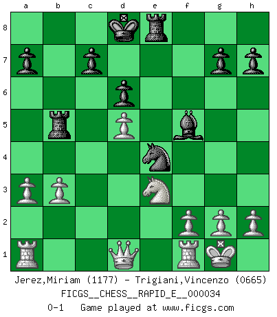 Last move : 0-1 2010 November 29 22:18:33 [Event "FICGS__CHESS__RAPID_E__000034"] [Site "FICGS"] [Date "2010.08.28"] [Round "1"] [White "Jerez,Miriam"] [Black "Trigiani,Vincenzo"] [Result "0-1"] [WhiteElo "1177"] [BlackElo "0665"] 1.e4 e5 2.Nf3 Bc5 3.Nxe5 Nf6 4.Bc4 d6 5.Nxf7 b5 6.Nxd8 bxc4 7.d4 Bb4+ 8.Bd2 Kxd8 9.Bxb4 Nxe4 10.O-O Bf5 11.Na3 Nc6 12.Nxc4 Nxb4 13.c3 Rb8 14.cxb4 Be6 15.d5 Rxb4 16.b3 Bf5 17.a3 Rb5 18.Ne3 Re8 0-1 This chess game has been lost on time (started : 2010.08.28 21:8:9) King's knight Opening Kingside Castling by player White (move 10) Player Black won this chess game. Follow this game move after move (download)It began to feel as though you were playing against Chess itself. - On playing against Robert Fischer. (Walter Shipman) Das Zentrum ist der Balkan des Schachbretts - Kriegshandlungen können in jedem Moment ausbrechen. (Aaron Nimzowitsch) No hay precio que sea tan grande por la cabellera del Rey enemigo. (Koblentz) La solitude du joueur d'Echecs à l'approche du mat est semblable à celle du condamné. (Francis Szpiner) Who needs drugs and alcohol if he can play Big Chess at FICGS ? (Heinz-Georg Lehnhoff)