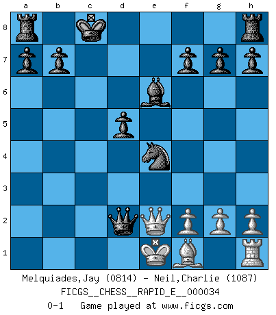 Last move : 0-1 2010 September 21 18:56:43 [Event "FICGS__CHESS__RAPID_E__000034"] [Site "FICGS"] [Date "2010.08.28"] [Round "1"] [White "Melquiades,Jay"] [Black "Neil,Charlie"] [Result "0-1"] [WhiteElo "0814"] [BlackElo "1087"] 1.e4 e6 2.Nf3 d5 3.d3 c5 4.d4 Nc6 5.Nc3 cxd4 6.Nxd4 Nf6 7.exd5 exd5 8.Bg5 Qd6 9.Qe2+ Be6 10.Ncb5 Qc5 11.Nc7+ Kd7 12.Ncb5 Nxd4 13.Nxd4 Qxd4 14.Rd1 Bb4+ 15.c3 Bxc3+ 16.Bd2 Bxb2 17.Be3 Qb4+ 18.Bd2 Qb6 19.Bc1 Qb4+ 20.Bd2 Bc3 21.a3 Qxa3 22.Qb5+ Kc8 23.Bxc3 Qxc3+ 24.Rd2 Ne4 25.Qe2 Qxd2+ 0-1 French defense Player Black won this chess game. Follow this game move after move (download)Modern Chess is too much concerned with things like Pawn structure. Forget it, Checkmate ends the game. (Nigel Short) Schachspieler können ausgezeichnet Varianten am Schachbrett berechnen, aber nicht im realen Leben. Zu stark ist der Individualismus im Schach ausgeprägt, und für viele ist ein kleiner momentaner persönlicher Vorteil wichtiger als ein weit größerer Vorteil von morgen. (Anatoly Karpov) No es una movida, aún la mejor movida que tu debas buscar, sino un plan comprensible. (Eugene Znosko-Borovsky) Ce qui caractérise les parties de combat, c'est que si le défenseur a constamment de difficiles problèmes à résoudre, l'attaquant doit chercher sans relâche de nouvelles possibilités d'attaque. (Koblentz) Lottery : A tax on people who are bad at math. (Author unknown)