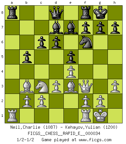 Last move : 1/2-1/2 2010 September 6 22:42:17 [Event "FICGS__CHESS__RAPID_E__000034"] [Site "FICGS"] [Date "2010.08.28"] [Round "1"] [White "Neil,Charlie"] [Black "Kehayov,Yulian"] [Result "1/2-1/2"] [WhiteElo "1087"] [BlackElo "1200"] 1.e4 e5 2.Nf3 Nc6 3.Bb5 Nd4 4.Bc4 Nxf3+ 5.Qxf3 Nf6 6.Nc3 c6 7.O-O d6 8.d3 Be7 9.h3 O-O 10.a4 a6 11.Be3 Bd7 12.Bb3 b5 13.axb5 axb5 1/2-1/2 Ruy Lopez : Bird's defense Kingside Castling by player White (move 7) Kingside Castling by player Black (move 9) This chess game ended in a draw. Follow this game move after move (download)Could we look into the head of a Chess player, we should see there a whole world of feelings, images, ideas, emotion and passion. (Alfred Binet) Matt entspricht nicht immer den Tatsachen. (Savielly Grigorievitsch Tartakower) Si tu oponente no puede hacer nada activo, entonces no apures la posición; En vez de eso, dejalo estar sentado ahí, sufriendo y rogandote por un empate. (Jeremy Silman) Botvinnik disait en comparant les échecs à la musique: Il existe une science dont le but est l'étude de l'acoustique et des sons. Mais il y a aussi un art qui se sert de l'océan des sons : c'est la musique. De toute évidence, il en est de même pour la pensée. La logique est l'étude des lois de la réflexion et les échecs reflètent, en tant qu'art, le côté logique de la réflexion, sous la forme d'images artistiques... Extrait de Fischer - Spassky, Reykjavik 1972 par Alexander & F. Wyndham (Ed. Solar), p 37. Whenever people agree with me, I always feel I must be wrong. (Oscar Wilde)