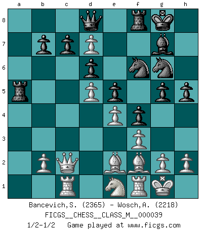 Last move : 1/2-1/2 2010 December 21 16:58:25 [Event "FICGS__CHESS__CLASS_M__000039"] [Site "FICGS"] [Date "2010.08.30"] [Round "1"] [White "Bancevich,Sergey"] [Black "Wosch,Arkadiusz"] [Result "1/2-1/2"] [WhiteElo "2365"] [BlackElo "2218"] 1.d4 Nf6 2.Nf3 g6 3.c4 Bg7 4.Nc3 O-O 5.e4 d6 6.Be2 e5 7.O-O Nc6 8.d5 Ne7 9.Ne1 Nd7 10.Be3 f5 11.f3 f4 12.Bf2 g5 13.a4 Ng6 14.a5 h5 15.Nb5 Nf6 16.Nxa7 Bd7 17.c5 Rxa7 18.c6 Qa8 19.cxd7 Rxa5 20.Rc1 Qd8 21.Qc2 1/2-1/2 King's Indian : East Indian defense Kingside Castling by player Black (move 4) Kingside Castling by player White (move 7) This chess game ended in a draw. Follow this game move after move (download)Chess mastery essentially consists of analyzing Chess positions accurately. (Mikhail Botvinnik) Obwohl ich alt bin, darf mir niemand den Finger in den Mund stecken, sonst beisse ich. (Wilhelm Steinitz) Bendita sea la memoria de aquel que dio al mundo este juego inmortal. (A. G. Gardiner) Les échecs sont utiles à l'exercice de la faculté de penser et à celle de l'imagination. Car nous devons posséder une méthode élaborée pour atteindre des buts partout où nous devons conduire notre raison. (Leibnitz) Any activity becomes creative when the doer cares about doing it right or doing it better. (John Updike)