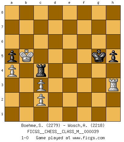 Last move : 1-0 2011 July 26 23:28:58 [Event "FICGS__CHESS__CLASS_M__000039"] [Site "FICGS"] [Date "2010.08.30"] [Round "1"] [White "Boehme,Sebastian"] [Black "Wosch,Arkadiusz"] [Result "1-0"] [WhiteElo "2279"] [BlackElo "2218"] 1.e4 c5 2.Nf3 Nc6 3.Bb5 g6 4.O-O Bg7 5.d3 Nf6 6.Bxc6 dxc6 7.h3 O-O 8.Nc3 Qc7 9.Be3 b6 10.a4 a5 11.Nd2 e5 12.f4 exf4 13.Bxf4 Qd8 14.Qf3 Nh5 15.Bh2 Be6 16.Kh1 Qd4 17.Nc4 Bxc4 18.dxc4 Qf6 19.Rae1 Qxf3 20.Rxf3 Rad8 21.e5 f5 22.g4 fxg4 23.Rxf8+ Rxf8 24.hxg4 Nf4 25.e6 Bxc3 26.bxc3 g5 27.Bxf4 gxf4 28.Kg2 Kg7 29.Kf3 Kf6 30.e7 Re8 31.Kxf4 Rxe7 32.g5+ Kf7 33.Rb1 Re2 34.Rxb6 Rf2+ 35.Ke5 Rg2 36.Kd6 Rxg5 37.Rb1 h5 38.Rh1 Rg4 39.Kxc5 Kg6 40.Rh3 Kg5 41.Kxc6 Rxc4+ 42.Kb5 1-0 Sicilian : Nimzovich-Rossolimo attack (with ...g6, without ...d6) Kingside Castling by player White (move 4) Kingside Castling by player Black (move 7) 10 pieces endgame at move 41 : White KRPPPP , Black KRPP WHITE : King + 1 Rook 4 Pawns BLACK : King + 1 Rook 2 Pawns 9 pieces endgame at move 41 : White KRPPP , Black KRPP WHITE : King + 1 Rook 3 Pawns BLACK : King + 1 Rook 2 Pawns Player White won this chess game. Follow this game move after move (download)What would Chess be without silly mistakes ? (Kurt Richter) Ich spiele 70 Eröffnungssysteme. (Viktor Kortschnoi) El Ajedrez, como la música, como el amor, tiene el poder de hacer feliz a la gente. (Siegbert Tarrasch) Les pièces de l'échiquier étaient impitoyables. Elles le retenaient, elles l'absorbaient. Il y avait de l'horreur en cela, mais aussi une harmonie unique. Car, qu'y a-t-il dans le monde, à part les échecs ? (V. Nabokov) Excelling at chess has long been considered a symbol of more general intelligence. That is an incorrect assumption in my view, as pleasant as it might be. But for the purposes of argument and investigation, chess is, in Russkin-Gutman's words, 'an unparalleled laboratory, since both the learning process and the degree of ability obtained can be objectified and quantified, providing an excellent comparative framework on which to use rigorous analytical techniques.' (The Chess Master and the Computer, by Garry Kasparov - 2010)