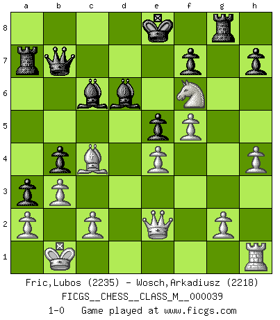 Last move : 1-0 2011 May 19 9:9:9 [Event "FICGS__CHESS__CLASS_M__000039"] [Site "FICGS"] [Date "2010.08.30"] [Round "1"] [White "Fric,Lubos"] [Black "Wosch,Arkadiusz"] [Result "1-0"] [WhiteElo "2235"] [BlackElo "2218"] 1.e4 c5 2.Nf3 Nc6 3.d4 cxd4 4.Nxd4 Nf6 5.Nc3 d6 6.Bg5 e6 7.Qd2 a6 8.O-O-O Bd7 9.f4 b5 10.Bxf6 gxf6 11.Kb1 Qb6 12.Nxc6 Bxc6 13.Qe1 Ra7 14.Bd3 b4 15.Ne2 Be7 16.f5 e5 17.Ng3 a5 18.Qe2 a4 19.Bc4 Rg8 20.Rd2 Rg5 21.Nh5 a3 22.b3 Qb7 23.h4 Rg8 24.Rxd6 Bxd6 25.Nxf6+ 1-0 Sicilian defense Queenside Castling by player White (move 8) Player White won this chess game. Follow this game move after move (download)At this time Fischer is simply a level above all the best Chessplayers in the world. (John Jacobs) Kann Schach nicht schließlich das Nationalspiel der Deutschen werden? Und welche weiteren Ausblicke bieten sich dann dar! Welche Hebung des allgemeinen Kultur-Niveaus, ja der Moral, wenn das Schachbrett den Kartentisch verdrängen würde! Wahrlich, ein Ziel, des Schweißes der Edlen wert! (Siegbert Tarrasch) No es una movida, aún la mejor movida que tu debas buscar, sino un plan comprensible. (Eugene Znosko-Borovsky) Le moment que je préfère le plus dans une rencontre, c'est celui où je sens que la personnalité de l'adversaire se brise. (Robert Fischer) I live to kill Traxler counterattack. (Ilmars Cirulis)