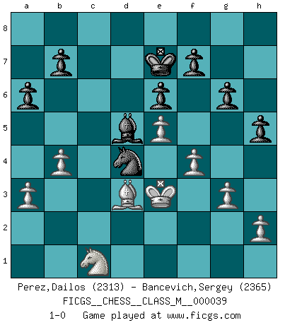 Last move : 1-0 2011 February 14 22:34:52 [Event "FICGS__CHESS__CLASS_M__000039"] [Site "FICGS"] [Date "2010.08.30"] [Round "1"] [White "Perez,Dailos"] [Black "Bancevich,Sergey"] [Result "1-0"] [WhiteElo "2313"] [BlackElo "2365"] 1.e4 c6 2.d4 d5 3.e5 Bf5 4.Nf3 e6 5.Be2 c5 6.Be3 cxd4 7.Nxd4 Ne7 8.c4 Nbc6 9.Qa4 a6 10.Na3 Qa5+ 11.Qxa5 Nxa5 12.O-O dxc4 13.Nxc4 Nxc4 14.Bxc4 Be4 15.Rac1 Bd5 16.Be2 Rc8 17.Rxc8+ Nxc8 18.f4 Ne7 19.a3 g6 20.b4 Bg7 21.Nf3 O-O 22.Bc5 Re8 23.Rc1 Rc8 24.Kf2 Bf8 25.Ne1 Nf5 26.Nd3 h5 27.Bxf8 Rxc1 28.Nxc1 Kxf8 29.g3 Ke7 30.Bd3 Nd4 31.Ke3 1-0 This chess game has been lost on time (started : 2010.08.30 15:12:16) Caro-Kann : Advance variation Kingside Castling by player White (move 12) Kingside Castling by player Black (move 21) Player White won this chess game. Follow this game move after move (download)In a gambit you give up a Pawn for the sake of getting a lost game. (Samuel Standige Boden) Ich trinke, ich rauche, ich spiele, ich liebe Frauen aber Fernschach ist ein Laster, das ich nicht habe. (Mikhail Nekhemyevich Tal) El Ajedrez es un regaderazo frío para la mente. (Sir John Simon) D'abord les bases : Jouez et étudiez, puis étudiez et jouez, ensuite jouez et étudiez, puis étudiez et jouez. Deuxièmement : Donnez toujours le meilleur de vous-même ! (Ken Smith) Optimism is a variety of information deficit. Sometimes especially true for correspondence chess games. (Michael Aigner)