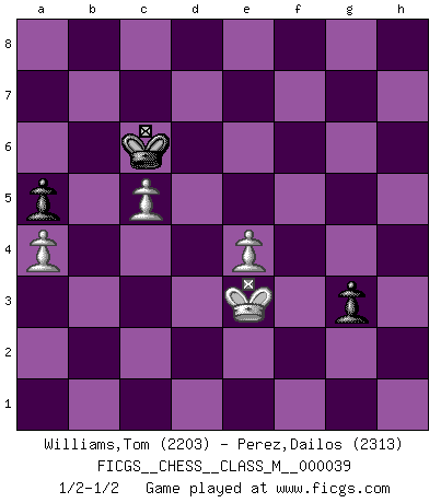 Last move : 1/2-1/2 2010 November 2 10:29:7 [Event "FICGS__CHESS__CLASS_M__000039"] [Site "FICGS"] [Date "2010.08.30"] [Round "1"] [White "Williams,Tom"] [Black "Perez,Dailos"] [Result "1/2-1/2"] [WhiteElo "2203"] [BlackElo "2313"] 1.c4 c6 2.Nf3 Nf6 3.Nc3 d5 4.d4 e6 5.Bg5 Nbd7 6.Rc1 Be7 7.e3 O-O 8.Bd3 dxc4 9.Bxc4 Nd5 10.Bf4 Nxf4 11.exf4 b5 12.Bd3 Bb7 13.O-O b4 14.Ne4 Rc8 15.Ne5 c5 16.Nxd7 Qxd7 17.Nxc5 Bxc5 18.Rxc5 Rxc5 19.dxc5 Qc6 20.Qf3 Qxf3 21.gxf3 Bxf3 22.Rc1 Rc8 23.Kf1 a5 24.Ke1 Kf8 25.Kd2 Bd5 26.a3 bxa3 27.bxa3 Ke7 28.Ke3 g6 29.Bb5 Kd8 30.a4 Kc7 31.Rd1 Rb8 32.Rd3 Bc6 33.Rb3 f6 34.Rb1 Ba8 35.Rd1 Rd8 36.Rxd8 Kxd8 37.h4 Kc7 38.Bc4 e5 39.fxe5 fxe5 40.Bb5 Bc6 41.Kd3 Kb7 42.Kc3 h6 43.Bxc6+ Kxc6 44.Kc4 g5 45.hxg5 hxg5 46.f3 e4 47.fxe4 g4 48.Kd4 g3 49.Ke3 1/2-1/2 English : Caro-Kann defensive system Kingside Castling by player Black (move 7) Kingside Castling by player White (move 13) 10 pieces endgame at move 43 : White KPPPP , Black KPPPP WHITE : King + 4 Pawns BLACK : King + 4 Pawns 9 pieces endgame at move 45 : White KPPPP , Black KPPP WHITE : King + 4 Pawns BLACK : King + 3 Pawns 8 pieces endgame at move 45 : White KPPP , Black KPPP WHITE : King + 3 Pawns BLACK : King + 3 Pawns 7 pieces endgame at move 47 : White KPPP , Black KPP WHITE : King + 3 Pawns BLACK : King + 2 Pawns This chess game ended in a draw. Follow this game move after move (download)Capture of the adverse King is the ultimate but not the first object of the game. (William Steinitz) Schach sollte überall auf der Welt Schulfach werden. Es fördert die geistige Auseinandersetzung. Es lehrt die Demut in der Niederlage. (Garry Kasparov) Es el objetivo de la escuela moderna no tratar cada posición de acuerdo a una regla general, sino de acuerdo al principio inherente en la posición. (Richard Reti) Les Echecs sont affaire de jugement sensible. Savoir quand frapper et quand esquiver. (Fischer) 'preceded by its own quotation yields a falsehood' preceded by its own quotation yields a falsehood. (W. V. O. Quine - Set Theory And Its Logic, 1953)