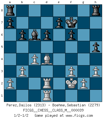 Last move : 1/2-1/2 2011 February 7 15:46:8 [Event "FICGS__CHESS__CLASS_M__000039"] [Site "FICGS"] [Date "2010.08.30"] [Round "1"] [White "Perez,Dailos"] [Black "Boehme,Sebastian"] [Result "1/2-1/2"] [WhiteElo "2313"] [BlackElo "2279"] 1.e4 c5 2.c3 Nf6 3.e5 Nd5 4.Nf3 Nc6 5.Bc4 Nb6 6.Bb3 c4 7.Bc2 Qc7 8.Qe2 g5 9.h3 Bg7 10.O-O Nxe5 11.Nxg5 Nd5 12.d4 cxd3 13.Bxd3 h6 14.Nf3 Nxd3 15.Qxd3 Qc6 16.Na3 Nc7 17.Re1 d6 18.Nc2 Qd5 19.Nfd4 Bxd4 20.Nxd4 Ne6 21.Qf5 Qxf5 22.Nxf5 h5 23.f3 Bd7 24.Bd2 Kd8 25.Be3 f6 26.Rad1 Nf8 27.Nh4 Ke8 28.c4 b6 29.Rd2 Kf7 30.b3 Ng6 31.Nxg6 Kxg6 32.Kf2 Bc6 33.Bd4 Kf7 34.Red1 1/2-1/2 Sicilian : Alapin's variation (2.c3) Kingside Castling by player White (move 10) This chess game ended in a draw. Follow this game move after move (download)A man without frontiers. He didn't divide the East and the West, he brought them together in their admiration for him. (Ljubomir Ljubojevic, about Bobby Fischer's death) In Buenos Aires ist es nicht mein vorrangiges Ziel ein starkes Turnier zu organisieren, sondern ein Turnier für Gentlemen. Ich würde nie Kamsky einladen. Ich mag keine Probleme. (Miguel Najdorf) Las piezas de Ajedrez son los bloques del alfabeto que moldean los pensamientos; y esos pensamientos, aunque hagan un diseño visual en el tablero, expresan abstractamente su belleza como un poema. (Marcel Duchamp) Les échecs, c'est la lutte contre l'erreur. (Johannes Zukertort) I believe in luck. How else can you explain the success of those you dislike ? (Jean Cocteau)
