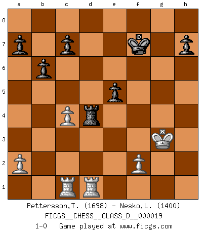 Last move : 1-0 2006 December 3 13:41:27 [Event "FICGS__CHESS__CLASS_D__000019"] [Site "FICGS"] [Date "2006.11.18"] [Round "1"] [White "Pettersson,Tobias"] [Black "Nesko,Lawrence"] [Result "1-0"] [WhiteElo "1698"] [BlackElo "1400"] 1.Nf3 Nf6 2.g3 g6 3.Bg2 Bg7 4.O-O O-O 5.d3 d6 6.h3 Nbd7 7.e4 e5 8.Be3 b6 9.Qd2 Bb7 10.Bh6 d5 11.Bxg7 Kxg7 12.exd5 Bxd5 13.Nc3 Re8 14.Nxd5 Nxd5 15.Nh4 Nc5 16.c4 Nf4 17.Bxa8 Nxh3+ 18.Kh2 Nf4 19.Ng2 Nfxd3 20.Bc6 Re6 21.Bd5 Rd6 22.b4 Nxb4 23.Qxb4 Qg5 24.Qe1 Nd3 25.Qe3 Qh5+ 26.Kg1 g5 27.Qxd3 Rh6 28.Nh4 gxh4 29.Qf3 Qg6 30.Qxf7+ Qxf7 31.Bxf7 Kxf7 32.gxh4 Rg6+ 33.Kh2 Rg4 34.Rac1 Rxh4+ 35.Kg3 Rd4 36.Rfd1 1-0 Reti : King's Indian attack Kingside Castling by player White (move 4) Kingside Castling by player Black (move 4) Player White won this chess game. Follow this game move after move (download)You may learn much more from a game you lose than from a game you win. You will have to lose hundreds of games before becoming a good player. (Jose Raul Capablanca) Konzentriere dich auf materielle Gewinne. Nimm, was dir dein Gegner gibt, ausser es gibt einen guten Grund der dagegenspricht. (Robert James Fischer) En posiciones complicadas, Bobby Fischer pocas veces tuvo que temer de cualquiera. (Paul Keres) Toutes choses étant égales, c'est la conviction qui gagne. Alliée à une volonté de vaincre, elle sert de détonateur, suscite des idées, disperse les doutes et aide à penser clairement. (Robert Fischer) The Internet isn't free. It just has an economy that makes no sense to capitalism. (Brad Shapcott)