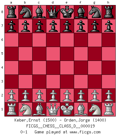 Last move : 0-1 2006 December 28 14:41:44 [Event "FICGS__CHESS__CLASS_D__000019"] [Site "FICGS"] [Date "2006.11.18"] [Round "1"] [White "Keber,Ernst"] [Black "Orden,Jorge"] [Result "0-1"] [WhiteElo "1500"] [BlackElo "1400"] 0-1 This chess game has been lost on time (started : 2006.11.18 14:12:55) Player Black won this chess game. Follow this game move after move (download)All I want to do, ever, is just play Chess. (Bobby Fischer) Ohne ihre Erfolge schmälern zu wollen würde ich sagen Petrosian, Spassky und Karpov verdanken ihre Siege ihren Trainern - Boleslavsky, Bondarevsky und Furman. (Mikhail Moiseyevich Botvinik) Cuando me preguntan: -¿Cual es el secreto que te hace hacer mejores movidas que tus oponentes?, Yo respondo: Me da gusto que me pregunten eso, porque, como veran, hay una simple razón. Yo pienso mis propias movidas y dejo a mi oponente que el piense las suyas. (Alexander Alekhine) J'ai vu le vaincu d'Echecs jouer des années durant dans l'espoir de la fête de la victoire. Car tu es plus riche de ce qu'elle existe si même elle n'est point pour toi. Ainsi de la perle du fond des mers. (Antoine de Saint-Exupéry) If I had no sense of humor, I would long ago have committed suicide. (Mahatma Gandhi)