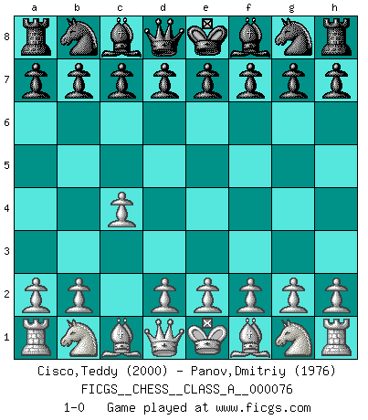 Last move : 1-0 2010 October 11 21:43:10 [Event "FICGS__CHESS__CLASS_A__000076"] [Site "FICGS"] [Date "2010.09.01"] [Round "1"] [White "Cisco,Teddy"] [Black "Panov,Dmitriy"] [Result "1-0"] [WhiteElo "2000"] [BlackElo "1976"] 1.c4 1-0 This chess game has been lost on time (started : 2010.09.01 12:26:43) English Opening Player White won this chess game. Follow this game move after move (download)A great player and a great example for many. His book My 60 Memorable Games had a big impact on me. It is a shame he didn't continue to enrich the world of chess with his unparalleled understanding after 1972. (Jan Timman, about Bobby Fischer's death) Ich organisiere ein großes Turnier, was mich etwa 120000 Dollar kostet. Ich denke, das ist das erste Mal in der Schachgeschichte, daß ein Schachgroßmeister auch als Mäzen auftritt. (Miguel Najdorf) La estratégia requiere pensar, la táctica requiere observación. (Max Euwe) On entre au jeu d'Echecs comme on entre en Religion. Pour le joueur d'Echecs, la partie d'Echecs c'est l'office, la messe, le défilé du 1er Mai, le dépôt de gerbe au Monument aux Morts. C'est un drame sacré. (Michel Roos) As a goal marker shodan is important. As a destination it is a poor place to stop. (Thomas Tamayo)