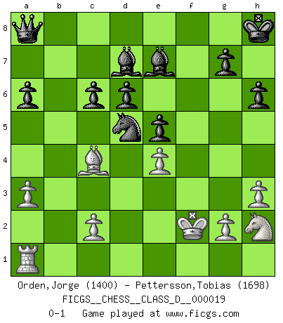 Last move : 0-1 2006 November 29 12:26:35 [Event "FICGS__CHESS__CLASS_D__000019"] [Site "FICGS"] [Date "2006.11.18"] [Round "1"] [White "Orden,Jorge"] [Black "Pettersson,Tobias"] [Result "0-1"] [WhiteElo "1400"] [BlackElo "1698"] 1.e4 c5 2.Nf3 Nc6 3.d4 cxd4 4.Nxd4 e5 5.Nf3 Nf6 6.Nc3 Be7 7.Be2 O-O 8.O-O d6 9.h3 h6 10.Be3 a6 11.a3 Ne8 12.Nd5 f5 13.Nb6 f4 14.Nxa8 fxe3 15.Bc4+ Kh8 16.b4 exf2+ 17.Rxf2 Bd7 18.Nh2 Rxf2 19.Kxf2 Qxa8 20.Qd5 Nf6 21.b5 Nxd5 22.bxc6 bxc6 0-1 Sicilian : Labourdonnais-Loewenthal variation Kingside Castling by player Black (move 7) Kingside Castling by player White (move 8) Player Black won this chess game. Follow this game move after move (download)We must make sure that Chess will not be like a dead language, very interesting, but for a very small group. (Sytze Faber) Früher wurde jeder komplizierte Zug, jedes interessante Opfer mit großem Beifall und Enthusiasmus aufgenommen. Heute schaltet man einfach seinen Fritz an, und man kann sehen, was los ist, ob der Zug geht oder nicht. (Vladimir Kramnik) Las leyes del Ajedrez no permiten una libre elección: tienes que mover quieras o no. (Emanuel Lasker) Plusieurs personnes se sont demandées comment Tal faisait pour gagner... En fait, c'est très simple ! Il met ses pièces au centre de l'échiquier et les sacrifie quelque part ! (David Bronstein) Vladimir Ras-Putin is still alive... He is also a good actor, I saw him in the Lord of the Rings. (Rodolfo d'Ettorre)