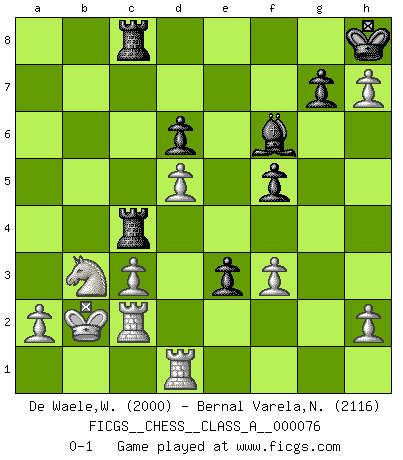Last move : 0-1 2010 November 13 21:41:24 [Event "FICGS__CHESS__CLASS_A__000076"] [Site "FICGS"] [Date "2010.09.01"] [Round "1"] [White "De Waele,Willy"] [Black "Bernal Varela,Nelson"] [Result "0-1"] [WhiteElo "2000"] [BlackElo "2116"] 1.e4 c5 2.Nf3 d6 3.d4 cxd4 4.Nxd4 Nf6 5.Nc3 a6 6.Be3 e5 7.Nb3 Be6 8.f3 Nbd7 9.Qd2 b5 10.O-O-O b4 11.Nd5 Bxd5 12.exd5 a5 13.Bb5 a4 14.Na1 a3 15.Qxb4 axb2+ 16.Kxb2 Be7 17.g4 O-O 18.g5 Nh5 19.Nb3 Nb6 20.Rhg1 Qc7 21.Bc6 Rab8 22.Qe4 f6 23.g6 f5 24.gxh7+ Kh8 25.Qd3 Qa7 26.Kb1 Nf4 27.Qb5 Bf6 28.Rde1 Rfc8 29.c3 Qc7 30.Bxf4 exf4 31.Qd3 Nd7 32.Bxd7 Qxd7 33.Rc1 Qa7 34.Rgd1 Qe3 35.Kb2 Rb4 36.Rc2 Rbc4 37.Qxe3 fxe3 0-1 Sicilian : Najdorf, Byrne (English) attack Queenside Castling by player White (move 10) Kingside Castling by player Black (move 17) Player Black won this chess game. Follow this game move after move (download)During a Chess competition a Chessmaster should be a combination of a beast of prey and a monk. (Alexander Alekhine) Die FIDE ist dabei in die Hände der russischen Mafia zu fallen. (Larry Evans) No existe un remordimiento como el remordimiento del Ajedrez. (H. G. Wells) Les sacrifices démontrent seulement que quelqu'un a gaffé. (Savielly Tartacover) Life is pleasant. Death is peaceful. It's the transition that's troublesome. (Isaac Asimov)