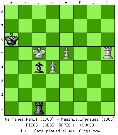 Last move : 1-0 2010 September 10 11:14:26 [Event "FICGS__CHESS__RAPID_A__000088"] [Site "FICGS"] [Date "2010.09.01"] [Round "1"] [White "Germanes,Ramil"] [Black "Kasznia,Ireneusz"] [Result "1-0"] [WhiteElo "1980"] [BlackElo "1886"] 1.d4 Nf6 2.c4 e6 3.Nc3 d5 4.Nf3 Be7 5.Bg5 Nbd7 6.cxd5 exd5 7.e3 c6 8.Qc2 O-O 9.Bd3 Re8 10.O-O Nf8 11.h3 Ne4 12.Bf4 f5 13.Ne5 Bd6 14.f3 Bxe5 15.Bxe5 Nxc3 16.bxc3 Ng6 17.f4 Nxe5 18.fxe5 g6 19.Rab1 b5 20.a4 a6 21.Rb2 Qh4 22.Ra1 Bd7 23.Rba2 c5 24.Qf2 Qxf2+ 25.Kxf2 c4 26.Be2 Kf7 27.axb5 Bxb5 28.g4 Reb8 29.gxf5 gxf5 30.Bh5+ Ke7 31.Kf3 Rg8 32.Kf4 Rad8 33.Bd1 Rg6 34.Ba4 Rh6 35.Bxb5 Rg8 36.Rh1 Rh4+ 37.Kf3 axb5 38.Ra7+ Ke6 39.Ra6+ Ke7 40.Rb6 Rg6 41.Rxb5 Ke6 42.Rb8 Kd7 43.Rf8 Rgh6 44.Kg3 Re4 45.Kf2 Reh4 46.Ra1 Rxh3 47.Ra7+ Kc6 48.Rf6+ Kb5 49.Rb7+ Ka5 50.Rxh6 Rxh6 51.Kg3 Rg6+ 52.Kf4 h5 53.Kxf5 Rg3 54.Ke6 Rxe3 55.Kxd5 Rxc3 56.Kc5 Ka6 57.Rh7 Rc1 58.Rxh5 1-0 Queen's pawn game Kingside Castling by player Black (move 8) Kingside Castling by player White (move 10) 10 pieces endgame at move 54 : White KRPPP , Black KRPPP WHITE : King + 1 Rook 3 Pawns BLACK : King + 1 Rook 3 Pawns 9 pieces endgame at move 55 : White KRPPP , Black KRPP WHITE : King + 1 Rook 3 Pawns BLACK : King + 1 Rook 2 Pawns 8 pieces endgame at move 55 : White KRPP , Black KRPP WHITE : King + 1 Rook 2 Pawns BLACK : King + 1 Rook 2 Pawns 7 pieces endgame at move 58 : White KRPP , Black KRP WHITE : King + 1 Rook 2 Pawns BLACK : King + 1 Rook 1 Pawn Player White won this chess game. Follow this game move after move (download)If you aren't afraid of Spassky, then I have removed the element of money. (Jim Slater) Schach ist Leben. (Robert James Fischer) Bobby solo arroja las piezas y solas caen en las casillas correctas. (Miguel Najdorf ) Je fais ceci parce que dans cinquante coups j'obtiendrai cela; je m'appelle Mikhail Moisevitch Botvinnik. (Botvinnik) I fear not the man who has practiced 10,000 kicks once, but I fear the man who has practiced one kick 10,000 times. (Bruce Lee)