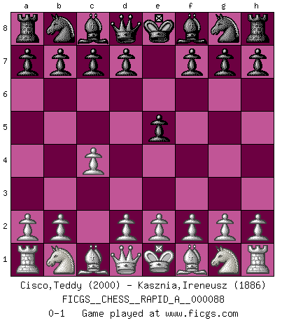 Last move : 0-1 2010 October 3 9:21:3 [Event "FICGS__CHESS__RAPID_A__000088"] [Site "FICGS"] [Date "2010.09.01"] [Round "1"] [White "Cisco,Teddy"] [Black "Kasznia,Ireneusz"] [Result "0-1"] [WhiteElo "2000"] [BlackElo "1886"] 1.c4 e5 0-1 This chess game has been lost on time (started : 2010.09.01 12:28:0) English Opening Player Black won this chess game. Follow this game move after move (download)I feel as if I were a piece in a game of Chess, when my opponent says of it: That piece cannot be moved. (Soren Kierkegaard) Viele Opfer benötigen überhaupt keine konkrete Berechnung. Es genügt sich die entstehende Position kurz vorzustellen, um uns davon zu überzeugen, dass das Opfer korrekt ist. (Mikhail Nekhemyevich Tal) El Ajedrez es un mar en el cual un mosquito puede beber y un elefante puede bañarse. (Refrán Hindú) À la honte des hommes, on sait que les lois du jeu sont les seules qui soient partout justes, claires, inviolables et exécutées. Pourquoi l'Indien qui a donné les règles du jeu d'échecs est-il obéi de bon gré dans toute la terre, et que les décrétales des papes, par exemple, sont aujourd'hui un objet d'horreur et de mépris ? C'est que l'inventeur des échecs combina tout avec justesse pour la satisfaction des joueurs, et que les papes, dans leurs décrétales, n'eurent en vue que leur seul avantage. L'Indien voulut exercer également l'esprit des hommes et leur donner du plaisir; les papes ont voulu abrutir l'esprit des hommes. Voltaire (Dictionnaire philosophique / Garnier 1967) Drag your thoughts away from your troubles... by the ears, by the heels, or any other way you can manage it. (Mark Twain)
