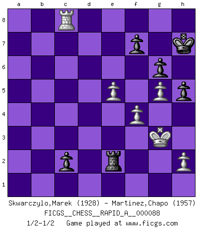 Last move : 1/2-1/2 2010 October 25 8:58:5 [Event "FICGS__CHESS__RAPID_A__000088"] [Site "FICGS"] [Date "2010.09.01"] [Round "1"] [White "Skwarczylo,Marek"] [Black "Martinez,Chapo"] [Result "1/2-1/2"] [WhiteElo "1928"] [BlackElo "1957"] 1.d4 Nf6 2.Nf3 e6 3.c4 d5 4.Nc3 c6 5.e3 Nbd7 6.Bd3 dxc4 7.Bxc4 b5 8.Bd3 Bb7 9.e4 b4 10.Na4 c5 11.e5 Nd5 12.O-O cxd4 13.Re1 g6 14.Bg5 Qa5 15.Nxd4 a6 16.a3 bxa3 17.bxa3 Bg7 18.Rb1 Rb8 19.Bd2 Qd8 20.f4 O-O 21.Be4 Re8 22.Kh1 Bh6 23.Ne2 Qe7 24.Nec3 Ba8 25.Rxb8 Rxb8 26.Bxd5 exd5 27.Bc1 Nc5 28.Nxc5 Qxc5 29.Ne2 Bc6 30.Nd4 Qc3 31.Nxc6 Qxc6 32.Qd3 Qc4 33.Qxc4 dxc4 34.g3 Bf8 35.Re3 Rb1 36.Rc3 Bxa3 37.Rxa3 Rxc1+ 38.Kg2 c3 39.Rxa6 Rc2+ 40.Kh3 Rd2 41.Rc6 c2 42.Rc8+ Kg7 43.g4 h5 44.g5 Re2 45.Kg3 Kh7 1/2-1/2 Queen's pawn game Kingside Castling by player White (move 12) Kingside Castling by player Black (move 20) This chess game ended in a draw. Follow this game move after move (download)The hardest game to win is a won game. (Emanuel Lasker) Er war ein guter Schachspieler, aber ich kann Leute nicht ausstehen, die 'Heil Hitler' rufen (Über Alexander Aljechin). (Miguel Najdorf) Sin errores no puede haber brillantez. (Emanuel Lasker) Comme les marins qui ont mille raisons différentes d'aller en mer, les joueurs d'échecs en ont tout autant avant de s'installer devant une table et jouer... (Vincent Bertignac, philosophe) Creativity is allowing yourself to make mistakes. Art is knowing which ones to keep. (Scott Adams)