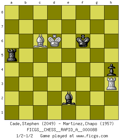 Last move : 1/2-1/2 2010 October 23 19:42:0 [Event "FICGS__CHESS__RAPID_A__000088"] [Site "FICGS"] [Date "2010.09.01"] [Round "1"] [White "Cade,Stephen"] [Black "Martinez,Chapo"] [Result "1/2-1/2"] [WhiteElo "2049"] [BlackElo "1957"] 1.Nf3 Nf6 2.c4 e6 3.g3 d5 4.Bg2 Be7 5.O-O O-O 6.b3 c5 7.Bb2 Nc6 8.e3 d4 9.exd4 cxd4 10.Re1 Re8 11.a3 a5 12.d3 Bd6 13.Nxd4 Nxd4 14.Bxd4 Bxg3 15.hxg3 Qxd4 16.Nd2 Qxd3 17.c5 Qb5 18.Qc2 Bd7 19.Ne4 Nxe4 20.Bxe4 f5 21.Bd3 Qc6 22.Rad1 Rad8 23.Bc4 b5 24.cxb6 Kh8 25.Qd3 Qxb6 26.Qd4 Qb8 27.Qc5 f4 28.Qe5 Qxe5 29.Rxe5 Bc6 30.Rxd8 Rxd8 31.Rc5 Be4 32.Kh2 g5 33.Rxg5 Rd1 34.f3 fxg3+ 35.Kxg3 Bf5 36.Kf4 a4 37.Ke5 Re1+ 38.Kd4 axb3 39.Bxb3 Rf1 40.a4 Rxf3 41.Kc4 h6 42.Rg1 e5 43.Kb4 Rf4+ 44.Kc5 Bd3 45.a5 h5 46.Rh1 h4 47.Kd5 Kg7 48.Kxe5 Re4+ 49.Kd6 Kf6 50.Rh3 Be2 51.Bd5 Ra4 52.Bc6 Rxa5 1/2-1/2 Reti Opening Kingside Castling by player White (move 5) Kingside Castling by player Black (move 5) 10 pieces endgame at move 39 : White KRBPP , Black KRBPP WHITE : King + 1 Rook 1 Bishop 2 Pawns BLACK : King + 1 Rook 1 Bishop 2 Pawns 9 pieces endgame at move 40 : White KRBP , Black KRBPP WHITE : King + 1 Rook 1 Bishop 1 Pawn BLACK : King + 1 Rook 1 Bishop 2 Pawns 8 pieces endgame at move 48 : White KRBP , Black KRBP WHITE : King + 1 Rook 1 Bishop 1 Pawn BLACK : King + 1 Rook 1 Bishop 1 Pawn 7 pieces endgame at move 52 : White KRB , Black KRBP WHITE : King + 1 Rook 1 Bishop BLACK : King + 1 Rook 1 Bishop 1 Pawn This chess game ended in a draw. Follow this game move after move (download)The passed pawn is a criminal, who should be kept under lock and key. Mild measures, such as police surveillance, are not sufficient. (Nimzovitch) Ich habe kein Problem mit Frauen, sondern nur mit dem Niveau ihres Schachspiels (Judith Polgar) El Ajedrez es de 30 a 40 por ciento psicología. Uno no cuenta con esto cuando se juega contra una computadora. No lo puedo confundir. (Judith Polgar) La victoire dans une partie d'Echecs appartient la plupart du temps à celui qui voit un peu plus loin que l'adversaire. (Lasker) The only thing that overcomes hard luck is hard work. (Harry Golden)