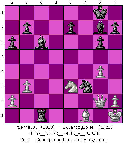Last move : 0-1 2010 October 30 10:26:52 [Event "FICGS__CHESS__RAPID_A__000088"] [Site "FICGS"] [Date "2010.09.01"] [Round "1"] [White "Pierre,Jonathan"] [Black "Skwarczylo,Marek"] [Result "0-1"] [WhiteElo "1950"] [BlackElo "1928"] 1.e4 c5 2.Nf3 Nc6 3.Bb5 g6 4.O-O Bg7 5.Re1 a6 6.Bf1 Nf6 7.c3 O-O 8.d4 d5 9.e5 Ne4 10.Be3 Qb6 11.b3 Qc7 12.Nfd2 Rd8 13.Qc1 Bf5 14.f3 Nxd2 15.Qxd2 Rac8 16.g4 Bd7 17.Qf2 Rf8 18.Rc1 f6 19.exf6 Rxf6 20.Qg2 cxd4 21.cxd4 Re6 22.Bf2 Qf4 23.Nc3 Nxd4 24.Nxd5 Nxf3+ 25.Kh1 Qxc1 26.Rxc1 Rxc1 27.Be3 Rxe3 28.Nxe3 Bc6 0-1 Sicilian : Nimzovich-Rossolimo attack (with ...g6, without ...d6) Kingside Castling by player White (move 4) Kingside Castling by player Black (move 7) Player Black won this chess game. Follow this game move after move (download)It is not a move, even the best move that you must seek, but a realizable plan. (Eugene Znosko-Borovsky) Ich bin stolz ein Bulgare zu sein. (Veselin Topalov) La señal de un Gran Maestro es su habilidad de ganar una partida rápidamente y sin dolor. (Irving Chernev) Roi des jeux et jeu des rois, les échecs portent en eux un sentiment d'infini. Ils donnent à celui qui s'est efforcé d'en approfondir les arcanes l'impression de n'être pas à la mesure de l'homme; en fait, ils constituent un résumé de l'univers, un microcosme, et figurent cette grande échelle qui, dans les plans de la lumière descend jusqu'à la matière, qui des abîmes insondables remonte jusqu'en l'infini de Dieu. (Pyrame) The beginning is the most important part of the work. (Plato)