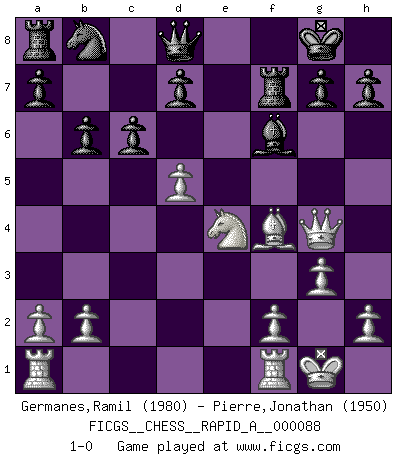 Last move : 1-0 2010 October 12 23:18:36 [Event "FICGS__CHESS__RAPID_A__000088"] [Site "FICGS"] [Date "2010.09.01"] [Round "1"] [White "Germanes,Ramil"] [Black "Pierre,Jonathan"] [Result "1-0"] [WhiteElo "1980"] [BlackElo "1950"] 1.d4 Nf6 2.c4 e6 3.Nf3 b6 4.g3 Bb7 5.Bg2 Be7 6.O-O O-O 7.Nc3 Ne4 8.Qc2 f5 9.Ne5 Nd6 10.Bxb7 Nxb7 11.e4 Nd6 12.exf5 Nxf5 13.Qe4 c6 14.d5 exd5 15.cxd5 Nd6 16.Qg4 Bf6 17.Bf4 Nf7 18.Nxf7 Rxf7 19.Ne4 1-0 Queen's Indian : Old Main line, 7.Nc3 Kingside Castling by player White (move 6) Kingside Castling by player Black (move 6) Player White won this chess game. Follow this game move after move (download)Adequate compensation for a sacrifice is having a sound combination leading to a winning position; adequate compensation for a blunder is having your opponent snatch defeat from the jaws of victory. (Bruce A. Moon) Kasparov stellt für gewöhnlich die Regeln auf und bricht sie dann selbst wieder. (Alexej Shirov) Hay jugadores fuertes y personas amables y yo soy un jugador fuerte. (Bobby Fischer) Le jeu d'échecs est comme rejeté hors du temps. (Antoine de Saint-Exupéry) Plans are ideas that never come to fruition. (Daniel Parmet)