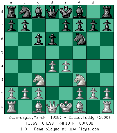 Last move : 1-0 2010 October 5 9:20:46 [Event "FICGS__CHESS__RAPID_A__000088"] [Site "FICGS"] [Date "2010.09.01"] [Round "1"] [White "Skwarczylo,Marek"] [Black "Cisco,Teddy"] [Result "1-0"] [WhiteElo "1928"] [BlackElo "2000"] 1.d4 d6 2.e4 Nf6 3.Nc3 c6 4.Nf3 1-0 This chess game has been lost on time (started : 2010.09.01 12:28:0) Queen's Pawn Player White won this chess game. Follow this game move after move (download)The combination player thinks forward; he starts from the given position, and tries the forceful moves in his mind. (Emanuel Lasker) Offener Brief an US-Präsident Bush anlässlich der Verhaftung Bobby Fishers: Verhaften Sie mich. Stecken Sie mich in dieselbe Zelle wie Bobby Fisher und geben Sie uns ein Schachspiel mit. (Boris Vassilievich Spassky) Morphy probablemente fue el genio más grande de todos. (Bobby Fischer) La guerre est enfant de la passion, la passion est enfant du narcissisme et le narcissisme est l'enfant. (...) Une autre partie ? (Thibault de Vassal) The human is the only animal species whose members are able to talk themselves into difficulties that would not otherwise exist. (Wendell Johnson)