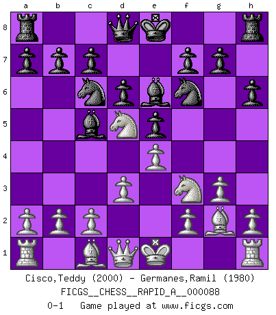 Last move : 0-1 2010 October 9 9:31:15 [Event "FICGS__CHESS__RAPID_A__000088"] [Site "FICGS"] [Date "2010.09.01"] [Round "1"] [White "Cisco,Teddy"] [Black "Germanes,Ramil"] [Result "0-1"] [WhiteElo "2000"] [BlackElo "1980"] 1.e4 e5 2.Nf3 Nf6 3.Nc3 Nc6 4.g3 Bc5 5.Bg2 d6 6.d3 h6 7.Nd5 Be6 0-1 This chess game has been lost on time (started : 2010.09.01 12:28:0) Petrov Three knights game Player Black won this chess game. Follow this game move after move (download)Pawns: they are the soul of this game, they alone form the attack and defense. (Philidor) Glücklicherweise sind Großmeister Ruben Fines reine Schachbücher weniger phallozentrisch [als seine Schachpsychologie] und deswegen auch weniger lächerlich. (Nigel Short) ¿Que sería del Ajedrez sin errores graciosos?. (Kurt Richter) Donnez-moi un Cavalier en 6e et je gagnerais toutes mes parties. (Steinitz) Before all elsed, be armed. (Niccolo Machiavelli)