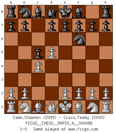 Last move : 1-0 2010 October 4 9:21:40 [Event "FICGS__CHESS__RAPID_A__000088"] [Site "FICGS"] [Date "2010.09.01"] [Round "1"] [White "Cade,Stephen"] [Black "Cisco,Teddy"] [Result "1-0"] [WhiteElo "2049"] [BlackElo "2000"] 1.d4 Nf6 2.c4 c5 3.d5 1-0 This chess game has been lost on time (started : 2010.09.01 12:28:0) Benoni defense Player White won this chess game. Follow this game move after move (download)Bobby Fischer is the greatest Chess player who has ever lived. (Ken Smith) Der Partner hat auch seine Existenzberechtigung. (Savielly Grigorievitsch Tartakower) Juega la Apertura como un libro, el Juego Medio como un mago y los Finales como una máquina. (Spielmann) Ne tendez aucun piège pour le plaisir ! Ne jouez rien dans l'espoir que l'adversaire réagisse de façon stupide ! Prenez toujours pour acquis que l'adversaire va trouver le meilleur coup ! Ne jouez jamais de coup dans l'espoir que l'adversaire ne voie pas la menace ! Chacun de vos coups doit améliorer la position d'une façon ou d'une autre. If you work for a living, why do you kill yourself working ? (Tuco to a chicken in The Good, The Bad and The Ugly)