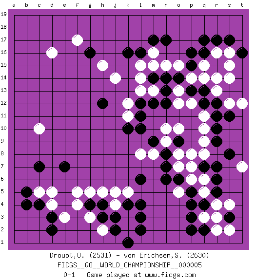 Last move : 0-1 2011 March 15 16:0:51 [Event "FICGS__GO__WORLD_CHAMPIONSHIP__000005"] [Site "FICGS"] [Date "2010.09.01"] [Round "2"] [Black "Drouot,Olivier"] [White "von Erichsen,Svante Carl"] [Result "0-1"] [Rating 1 "2531"] [Rating 2 "2630"] 1.q16 d16 2.p4 d5 3.j3 r4 4.s3 r3 5.r5 q5 6.q4 s4 7.r6 q6 8.r7 o5 9.q2 q3 10.p3 r2 11.p2 s2 12.p5 p6 13.o6 o7 14.n6 q8 15.r9 q9 16.r10 q10 17.r11 p12 18.o9 o8 19.n8 p8 20.n7 o10 21.q13 n9 22.m9 n10 23.q17 f17 24.c7 c10 25.e7 f5 26.c4 c5 27.b5 d4 28.b4 g3 29.d3 e3 30.d2 j4 31.k4 j5 32.h3 k3 33.h4 h5 34.g4 g5 35.l3 k2 36.l2 k5 37.l4 f4 38.j2 m8 39.l6 l8 40.l16 q14 41.p13 r13 42.q12 s16 43.s17 n15 44.n17 r16 45.r17 p14 46.o14 o15 47.p15 m16 48.m17 l15 49.k16 q15 50.p16 s14 51.r15 r14 52.t16 o13 53.n14 m13 54.n13 o12 55.m14 l14 56.m12 l13 57.n12 m15 58.l12 k12 59.l11 k11 60.l10 s15 61.k10 q11 62.r12 s12 63.s11 t12 64.s8 t7 65.q7 p7 66.h12 h2 67.k1 j14 68.g16 h15 0-1 Thibault de Vassal Another interesting game, once again somewhat far from my understanding... Congrats Svante Carl and thanks to you both for this great match! Here are the names of the openings (joseki) played in the four corners : Corner d4 : d5 j3 Takamoku (Gomok, Gaomu`) 5-4 Point. The takamoku (high) point (5-4). With its emphasis on influence, the 5-4 point complements the 4-4 (hoshi) point in creating an influence-oriented fuseki. Corner q4 : p4 r4 Takamoku (Gomok, Gaomu`) 5-4 Point. The takamoku (high) point (5-4). With its emphasis on influence, the 5-4 point complements the 4-4 (hoshi) point in creating an influence-oriented fuseki. Komoku. Black responds with 3-3, 3-5, 4-6, 4-7, 3-6, 3-7. Player White won this Go (weiqi, baduk) game. Follow this game move after move (download)In the sound of the stone you can hear its purpose. (Pierre Audouard) Creativity is inventing, experimenting, growing, taking risks, breaking rules, making mistakes, and having fun. (Mary Lou Cook)