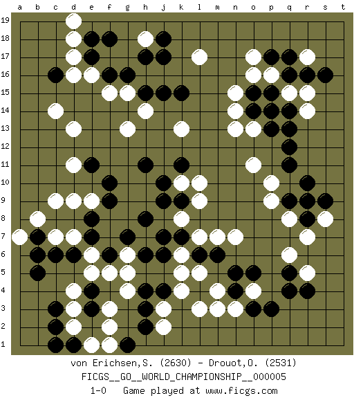 Last move : 1-0 2011 February 19 15:44:54 [Event "FICGS__GO__WORLD_CHAMPIONSHIP__000005"] [Site "FICGS"] [Date "2010.09.01"] [Round "3"] [Black "von Erichsen,Svante Carl"] [White "Drouot,Olivier"] [Result "1-0"] [Rating 1 "2630"] [Rating 2 "2531"] 1.q16 d4 2.r4 e16 3.p3 o4 4.o3 r5 5.q5 q6 6.q4 r7 7.r10 n7 8.c16 d13 9.c6 d7 10.d6 e6 11.e7 c7 12.b7 b8 13.b5 a7 14.b6 c9 15.e8 d9 16.f6 e5 17.c3 d3 18.c2 d2 19.d1 e1 20.c1 g4 21.g7 k4 22.f10 c14 23.e18 d17 24.j17 o17 25.p17 o16 26.q14 l17 27.f16 d18 28.k15 n13 29.q12 f15 30.g16 r17 31.q17 r15 32.r16 q15 33.p15 r14 34.q13 p16 35.s16 p14 36.o15 n15 37.o14 o13 38.p13 g15 39.h15 h14 40.j15 n14 41.p14 k13 42.f18 g13 43.e11 e9 44.f9 d11 45.j6 m3 46.l4 l3 47.j4 k5 48.h4 g5 49.h6 f2 50.n4 m4 51.n5 n3 52.m6 k6 53.k7 l7 54.l6 m7 55.o5 k8 56.j7 j2 57.h2 j3 58.h3 l5 59.g1 f5 60.j9 h18 61.e17 d16 62.j18 k10 63.j10 f1 64.e3 p10 65.q11 o11 66.k9 l9 67.k11 d19 68.h17 l10 69.h11 r9 70.s9 s8 71.q9 q8 72.r8 p9 73.r9 f3 74.e4 g6 75.h8 1-0 Thibault de Vassal Many mysterious moves, interesting game! Here are the names of the openings (joseki) played in the four corners : Corner d16 : e16 c16 Takamoku (Gomok, Gaomu`) 5-4 Point. The takamoku (high) point (5-4). With its emphasis on influence, the 5-4 point complements the 4-4 (hoshi) point in creating an influence-oriented fuseki. Komoku. White responds with 3-3, 3-5, 4-6, 4-7, 3-6, 3-7. Corner d4 : d4 c6 Hoshi (Hwajeom, Seongjeom, Xingwei`) 4-4 Point. The star or hoshi (4-4) point, emphasizing influence at the potential expense of territory. Ikken Kakari (Hankan Keolch'im, Yi Gua`jiao~, 1-Space Low Approach). Black 2 is the standard approach move to the 4-4. Corner q16 : q16 o17 Hoshi (Hwajeom, Seongjeom, Xingwei`) 4-4 Point. The star or hoshi (4-4) point, emphasizing influence at the potential expense of territory. Ikken Kakari (Hankan Keolch'im, Yi Gua`jiao~, 1-Space Low Approach). White 2 is the standard approach move to the 4-4. Player Black won this Go (weiqi, baduk) game. Follow this game move after move (download)The carpenter's square becomes ko. (Anonymous) Be who you are, and say what you feel because those who mind don't matter, and those who matter don't mind. (Dr Seuss)