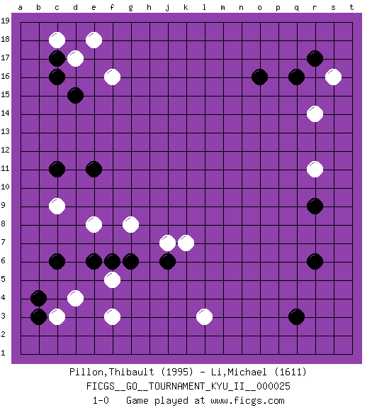 Last move : 1-0 2010 October 28 22:31:35 [Event "FICGS__GO__TOURNAMENT_KYU_II__000025"] [Site "FICGS"] [Date "2010.09.01"] [Round "1"] [Black "Pillon,Thibault"] [White "Li,Michael"] [Result "1-0"] [Rating 1 "1995"] [Rating 2 "1611"] 1.q16 d4 2.q3 d17 3.d15 f16 4.c17 c18 5.c16 e18 6.c11 c9 7.e11 f3 8.r9 r14 9.o16 r11 10.r6 s16 11.r17 l3 12.b4 c3 13.c6 e8 14.e6 g8 15.g6 f5 16.f6 j7 17.j6 k7 18.b3 1-0 This go game has been lost on time (started : 2010.09.01 16:22:28) Here are the names of the openings (joseki) played in the four corners : Corner d16 : d17 d15 Komoku (Somok, Xiao~mu`) 3-4 Point. The komoku (3-4) point is the traditional corner enclosure move.. Ikken Takagakari (Hankan Nop'dakeolch'im, Yi Gaogua`jiao~, 1-Space High Approach). The 5-4 approach move has become more popular in modern times, as modern Go emphasizes speed and influence. Corner q16 : q16 r14 Hoshi (Hwajeom, Seongjeom, Xingwei`) 4-4 Point. The star or hoshi (4-4) point, emphasizing influence at the potential expense of territory. Ikken Kakari (Hankan Keolch'im, Yi Gua`jiao~, 1-Space Low Approach). White 2 is the standard approach move to the 4-4. Player Black won this Go (weiqi, baduk) game. Follow this game move after move (download)Beware of the clumsy double contact. (Anonymous) I have opinions of my own - strong opinions - but I don't always agree with them. (George Bush)