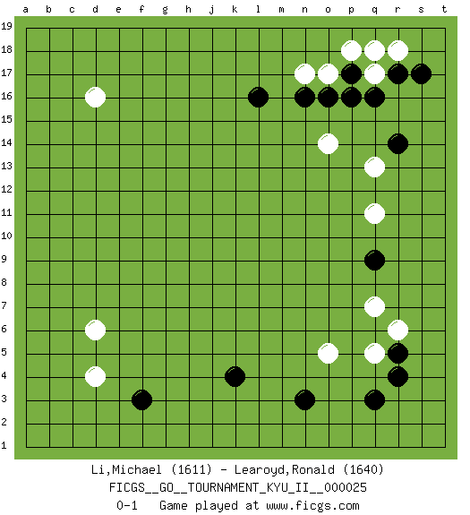 Last move : 0-1 2010 October 26 10:24:14 [Event "FICGS__GO__TOURNAMENT_KYU_II__000025 "] [Site "FICGS"] [Date "2010.09.01"] [Round "1"] [Black "Li,Michael "] [White "Learoyd,Ronald "] [Result "0-1"] [Rating 1 "1611"] [Rating 2 "1640"] 1.q16 d4 2.q3 d16 3.f3 d6 4.k4 o17 5.l16 o14 6.r14 q13 7.o16 q17 8.p17 p18 9.p16 q18 10.r17 r18 11.s17 n17 12.n16 q5 13.r5 r6 14.r4 q7 15.q9 o5 16.n3 q11 0-1 This go game has been lost on time (started : 2010.09.01 16:22:28) Here are the names of the openings (joseki) played in the four corners : Corner d4 : d4 f3Hoshi (Hwajeom, Seongjeom, Xingwei`) 4-4 Point. The star or hoshi (4-4) point, emphasizing influence at the potential expense of territory.Ikken Kakari (Hankan Keolch'im, Yi Gua`jiao~, 1-Space Low Approach). Black 2 is the standard approach move to the 4-4. Corner q16 : q16 o17Hoshi (Hwajeom, Seongjeom, Xingwei`) 4-4 Point. The star or hoshi (4-4) point, emphasizing influence at the potential expense of territory.Ikken Kakari (Hankan Keolch'im, Yi Gua`jiao~, 1-Space Low Approach). White 2 is the standard approach move to the 4-4. Corner q4 : q3 q5Komoku (Somok, Xiao~mu`) 3-4 Point. The komoku (3-4) point is the traditional corner enclosure move..Ikken Takagakari (Hankan Nop'dakeolch'im, Yi Gaogua`jiao~, 1-Space High Approach). The 5-4 approach move has become more popular in modern times, as modern Go emphasizes speed and influence. Player White won this Go (weiqi, baduk) game.Follow this game move after move (download ) Be a little patient. Keshi works ! (Anonymous) I would love to change the world, but they won't give me the source code. (Unknown)