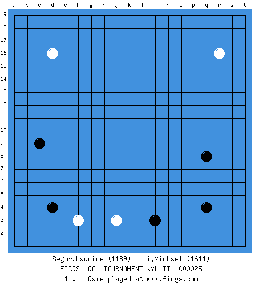 Last move : 1-0 2010 November 1 9:42:46 [Event "FICGS__GO__TOURNAMENT_KYU_II__000025"] [Site "FICGS"] [Date "2010.09.01"] [Round "1"] [Black "Segur,Laurine"] [White "Li,Michael"] [Result "1-0"] [Rating 1 "1189"] [Rating 2 "1611"] 1.d4 d16 2.q4 r16 3.c9 f3 4.m3 j3 5.q8 1-0 This go game has been lost on time (started : 2010.09.01 16:22:28) Here are the names of the openings (joseki) played in the four corners : Player Black won this Go (weiqi, baduk) game. Follow this game move after move (download)The weak player fears ko, the strong player seeks it. (Bill Taylor) As a goal marker shodan is important. As a destination it is a poor place to stop. (Thomas Tamayo)