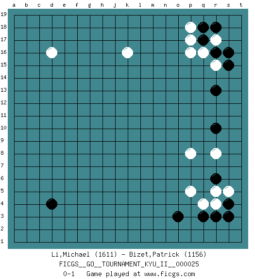 Last move : 0-1 2010 October 27 10:28:55 [Event "FICGS__GO__TOURNAMENT_KYU_II__000025"] [Site "FICGS"] [Date "2010.09.01"] [Round "1"] [Black "Li,Michael"] [White "Bizet,Patrick"] [Result "0-1"] [Rating 1 "1611"] [Rating 2 "1156"] 1.q17 q4 2.d4 d16 3.r6 r8 4.r3 r4 5.q3 p5 6.s4 s5 7.s3 r5 8.o3 r15 9.r10 p8 10.r13 r17 11.r16 q16 12.s16 p16 13.r18 p17 14.q18 p18 15.s15 k16 0-1 This go game has been lost on time (started : 2010.09.01 16:22:28) Here are the names of the openings (joseki) played in the four corners : Corner q4 : q4 r6 Hoshi (Hwajeom, Seongjeom, Xingwei`) 4-4 Point. The star or hoshi (4-4) point, emphasizing influence at the potential expense of territory. Ikken Kakari (Hankan Keolch'im, Yi Gua`jiao~, 1-Space Low Approach). Black 2 is the standard approach move to the 4-4. Corner q16 : q17 r15 Komoku (Somok, Xiao~mu`) 3-4 Point. The komoku (3-4) point is the traditional corner enclosure move.. Ikken Kakari (Hankan Keolch'im, Yi Gua`jiao~, 1-Space Low Pincer). The small knight move is the basic approach move to the 3-4 point stone. It has been continually used for over four centuries. There are limitless variations, with new moves constantly being discovered. White 2 opens the door to a treaure store of joseki. Player White won this Go (weiqi, baduk) game. Follow this game move after move (download)You have to like to win, and to learn to recognize the errors that gave you the victory. (Pierre Audouard) Every vice is only an exaggeration of a necessary and virtuous function. (Ralph Waldo Emerson, Journals 1936)