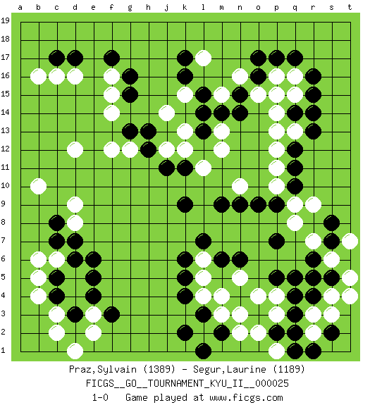 Last move : 1-0 2011 January 9 18:50:34 [Event "FICGS__GO__TOURNAMENT_KYU_II__000025"] [Site "FICGS"] [Date "2010.09.01"] [Round "1"] [Black "Praz,Sylvain"] [White "Segur,Laurine"] [Result "1-0"] [Rating 1 "1389"] [Rating 2 "1189"] 1.r16 d4 2.q3 d16 3.f17 n16 4.k16 l17 5.k17 p16 6.p17 q16 7.q17 d12 8.f3 q8 9.o16 o15 10.o17 p14 11.q14 q15 12.r15 p15 13.n15 m15 14.n14 q13 15.r14 p12 16.m14 k15 17.l15 d8 18.q10 p10 19.q11 p11 20.r13 r5 21.q12 p13 22.p9 q9 23.o9 m12 24.m9 n10 25.n9 l11 26.p7 r3 27.q4 m4 28.k4 o4 29.p5 p4 30.q5 r7 31.n6 l5 32.l7 p3 33.q2 r2 34.r4 s4 35.s5 s6 36.r6 t5 37.r5 t4 38.s2 s3 39.r1 t7 40.s8 r9 41.s7 p1 42.p2 o2 43.q1 l2 44.l3 m3 45.k2 n3 46.d6 c6 47.c5 d5 48.c4 c3 49.d3 e3 50.d2 e2 51.e6 c2 52.e4 d1 53.d3 b4 54.e5 b5 55.c7 b6 56.c8 d9 57.d7 b10 58.m2 l4 59.l1 n5 60.m6 n2 61.k5 l6 62.k6 f15 63.j11 k13 64.h13 j14 65.g15 f16 66.g16 g12 67.g13 f12 68.d17 b16 69.c17 c16 70.k9 j12 71.h12 f14 72.k11 k12 73.l13 m13 74.l14 1-0 Here are the names of the openings (joseki) played in the four corners : Corner d16 : d16 f17 Hoshi (Hwajeom, Seongjeom, Xingwei`) 4-4 Point. The star or hoshi (4-4) point, emphasizing influence at the potential expense of territory. Ikken Kakari (Hankan Keolch'im, Yi Gua`jiao~, 1-Space Low Approach). Black 2 is the standard approach move to the 4-4. Corner q16 : r16 n16 Komoku (Somok, Xiao~mu`) 3-4 Point. The komoku (3-4) point is the traditional corner enclosure move.. Corner d4 : d4 f3 Hoshi (Hwajeom, Seongjeom, Xingwei`) 4-4 Point. The star or hoshi (4-4) point, emphasizing influence at the potential expense of territory. Ikken Kakari (Hankan Keolch'im, Yi Gua`jiao~, 1-Space Low Approach). Black 2 is the standard approach move to the 4-4. Corner q4 : q3 q8 Komoku (Somok, Xiao~mu`) 3-4 Point. The komoku (3-4) point is the traditional corner enclosure move.. Player Black won this Go (weiqi, baduk) game. Follow this game move after move (download)Keep away from thickness. (Anonymous) Fortune favours the audacious. (Desiderius Erasmus)
