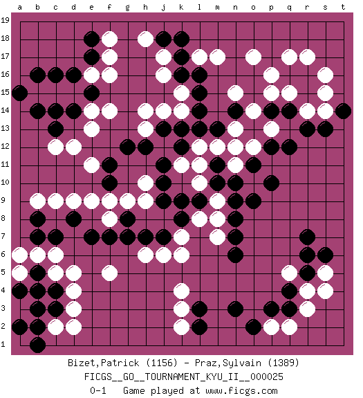 Last move : 0-1 2010 November 30 14:7:10 [Event "FICGS__GO__TOURNAMENT_KYU_II__000025"] [Site "FICGS"] [Date "2010.09.01"] [Round "1"] [Black "Bizet,Patrick"] [White "Praz,Sylvain"] [Result "0-1"] [Rating 1 "1156"] [Rating 2 "1389"] 1.q4 d3 2.d16 r17 3.q16 q17 4.r16 p16 5.q14 p15 6.p14 o14 7.p12 f17 8.l16 o17 9.l14 q15 10.r15 r14 11.r13 s14 12.s13 s16 13.t14 s15 14.e17 f16 15.d14 j16 16.r7 k4 17.o9 c12 18.c13 d12 19.k17 j17 20.c7 c9 21.c4 d4 22.c3 d5 23.b8 c5 24.b5 b6 25.b4 c6 26.e7 f5 27.n3 r3 28.q3 r4 29.r5 s5 30.s6 q5 31.r6 q2 32.p3 p2 33.o2 s4 34.n6 j14 35.m13 c2 36.b2 d2 37.b1 e9 38.g7 h6 39.d8 d9 40.h7 j6 41.j7 k7 42.k8 k6 43.l2 g9 44.g8 h9 45.j9 k2 46.j11 c15 47.c14 d15 48.e15 e16 49.c16 b15 50.b16 f14 51.b14 e14 52.a15 a3 53.a2 m7 54.n7 l8 55.l9 m9 56.n8 l10 57.k9 m8 58.m10 l11 59.k12 n11 60.n10 l12 61.k13 o10 62.n9 o12 63.o13 n13 64.p10 f8 65.f7 p13 66.q12 m17 67.l3 k3 68.m11 m12 69.o11 n12 70.g12 h13 71.h12 h10 72.j10 b9 73.f11 e11 74.f10 f9 75.b7 a5 76.b3 e13 77.e18 f18 78.j13 h14 79.j18 l17 80.k16 h18 81.k18 k15 82.l15 k14 83.l13 a6 84.a4 k11 85.n14 n15 0-1 Here are the names of the openings (joseki) played in the four corners : Corner q16 : r17 q16 San-San (Sam-Sam, San-San) 3-3 Point. The San-San (3-3) point, emphasizing territory at the expense of influence. Kata-tsuki (shoulder hit). The shoulder-hit is the traditional answer to the 3-3. The direction of White 3 depends on the positions on the side. Crawling once may be the premise for a follow-up move of sliding with a knight's move in the opposite direction. If White plays 3 at 3-4 (to the right), the follow-on knight's move is then played at the top (e.g. 3-4, 4-5, 5-2). White's knight's move reduces territory potential on the side it is played. Corner d16 : d16 f17 Hoshi (Hwajeom, Seongjeom, Xingwei`) 4-4 Point. The star or hoshi (4-4) point, emphasizing influence at the potential expense of territory. Ikken Kakari (Hankan Keolch'im, Yi Gua`jiao~, 1-Space Low Approach). White 2 is the standard approach move to the 4-4. Corner d4 : d3 c7 Komoku (Somok, Xiao~mu`) 3-4 Point. The komoku (3-4) point is the traditional corner enclosure move.. Player White won this Go (weiqi, baduk) game. Follow this game move after move (download)Never try to cut bamboo joints. (Anonymous) Luck never made a man wise. (Seneca, Letters to Lucilius)