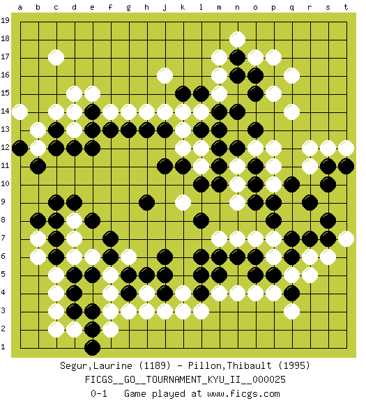 Last move : 0-1 2010 December 31 14:14:15 [Event "FICGS__GO__TOURNAMENT_KYU_II__000025"] [Site "FICGS"] [Date "2010.09.01"] [Round "1"] [Black "Segur,Laurine"] [White "Pillon,Thibault"] [Result "0-1"] [Rating 1 "1189"] [Rating 2 "1995"] 1.d4 q16 2.q4 d15 3.c13 c14 4.c9 r6 5.r9 p6 6.q6 q5 7.q7 r5 8.p5 p4 9.o5 o4 10.o6 p7 11.r7 q3 12.p9 o7 13.n6 n7 14.m6 m7 15.l6 n9 16.o11 k9 17.j11 l11 18.l13 f3 19.j6 j3 20.h9 k12 21.j13 k13 22.k15 l14 23.m13 k14 24.n14 j14 25.h13 h14 26.g13 g14 27.e12 m16 28.e14 e15 29.l15 m15 30.m14 j16 31.k11 l12 32.m10 n10 33.m11 n11 34.m12 o12 35.n12 p11 36.o10 r12 37.s11 s12 38.s8 q14 39.o13 p12 40.o16 c3 41.d3 c4 42.c6 c5 43.d5 d2 44.g4 g3 45.j4 k3 46.l4 l3 47.l8 b6 48.c7 b13 49.c12 b12 50.b11 c17 51.n17 m17 52.p8 m4 53.m5 n4 54.q10 p17 55.l10 o17 56.n16 n18 57.a12 f4 58.g5 f5 59.f6 a14 60.e2 c2 61.e3 f2 62.e1 b7 63.b8 k4 64.l5 h4 65.j5 g6 66.h5 e6 67.f7 d6 68.e5 d7 69.c8 d8 70.d9 f14 71.f13 d13 72.d12 d14 73.e13 r11 74.s10 s6 75.e8 p15 76.o15 t12 77.t11 p10 78.o9 h3 79.s7 t7 0-1 Here are the names of the openings (joseki) played in the four corners : Corner d16 : d15 c13 Takamoku (Gomok, Gaomu`) 5-4 Point. The takamoku (high) point (5-4). With its emphasis on influence, the 5-4 point complements the 4-4 (hoshi) point in creating an influence-oriented fuseki. Corner q4 : q4 r6 Hoshi (Hwajeom, Seongjeom, Xingwei`) 4-4 Point. The star or hoshi (4-4) point, emphasizing influence at the potential expense of territory. Ikken Kakari (Hankan Keolch'im, Yi Gua`jiao~, 1-Space Low Approach). White 2 is the standard approach move to the 4-4. Corner q16 : q16 o11 Hoshi (Hwajeom, Seongjeom, Xingwei`) 4-4 Point. The star or hoshi (4-4) point, emphasizing influence at the potential expense of territory. Player White won this Go (weiqi, baduk) game. Follow this game move after move (download)The weak player fears ko, the strong player seeks it. (Bill Taylor) A cynic is a man who knows the price of everything but the value of nothing. (Oscar Wilde)