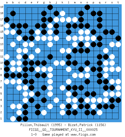 Last move : 1-0 2011 February 3 20:17:42 [Event "FICGS__GO__TOURNAMENT_KYU_II__000025"] [Site "FICGS"] [Date "2010.09.01"] [Round "1"] [Black "Pillon,Thibault"] [White "Bizet,Patrick"] [Result "1-0"] [Rating 1 "1995"] [Rating 2 "1156"] 1.q17 q4 2.d16 d4 3.r6 r9 4.r3 r4 5.q3 p4 6.s4 s5 7.s3 r5 8.o3 p3 9.p2 q2 10.o2 o4 11.n4 n5 12.m5 m4 13.n3 l4 14.m6 j4 15.q7 s7 16.q9 r10 17.q10 r12 18.n6 j17 19.r15 m17 20.d10 d6 21.g17 d12 22.c8 f12 23.f3 f4 24.g4 h5 25.e4 e5 26.f5 h7 27.e6 d5 28.g6 h6 29.d3 c3 30.e7 c7 31.d7 c6 32.o5 c14 33.c16 h9 34.g10 j10 35.h11 b15 36.b16 c11 37.d2 c2 38.b8 b7 39.j15 h18 40.g18 o18 41.l16 l17 42.s8 r8 43.s6 t6 44.r11 s11 45.r7 t7 46.t8 t5 47.q11 s13 48.m10 l7 49.q8 s10 50.q13 n15 51.n13 m8 52.e14 b13 53.h17 p16 54.p18 p17 55.s15 f14 56.e15 e13 57.n9 l9 58.c1 b1 59.d1 b3 60.l10 k10 61.q18 k12 62.j18 k18 63.h19 f15 64.f16 h3 65.l2 k2 66.l3 k3 67.j16 k17 68.t4 t9 69.p5 s9 70.p15 o15 71.q16 o13 72.o12 p14 73.q14 n8 74.n18 o17 75.o19 l14 76.l15 m14 77.n17 m13 78.m16 o8 79.o16 o9 80.o10 h13 81.p13 o14 82.p9 g9 83.f10 f9 84.e9 a16 85.a17 a15 86.b18 e11 87.e10 c10 88.a10 b9 89.a9 c9 90.d9 g2 91.m12 l12 92.l11 a11 93.c15 b10 94.a8 a7 95.d8 j14 96.f2 h15 97.f8 h16 98.n16 n14 99.n12 m3 100.m2 l5 101.l6 k6 102.d14 d13 103.d11 c12 104.g15 g14 105.g16 h14 106.t14 t13 107.g8 h8 108.o7 1-0 Here are the names of the openings (joseki) played in the four corners : Corner q4 : q4 r6 Hoshi (Hwajeom, Seongjeom, Xingwei`) 4-4 Point. The star or hoshi (4-4) point, emphasizing influence at the potential expense of territory. Ikken Kakari (Hankan Keolch'im, Yi Gua`jiao~, 1-Space Low Approach). Black 2 is the standard approach move to the 4-4. Corner q16 : q17 r12 Komoku (Somok, Xiao~mu`) 3-4 Point. The komoku (3-4) point is the traditional corner enclosure move.. Corner d16 : d16 j17 Hoshi (Hwajeom, Seongjeom, Xingwei`) 4-4 Point. The star or hoshi (4-4) point, emphasizing influence at the potential expense of territory. Player Black won this Go (weiqi, baduk) game. Follow this game move after move (download)Very few good moves are played. (Pierre Audouard) Whatever you do, don't be bored. This is absolutely the most exciting time we could have possibly hoped to be alive. And things are just starting. (From movie Waking life)