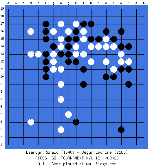 Last move : 0-1 2011 January 12 16:33:8 [Event "FICGS__GO__TOURNAMENT_KYU_II__000025"] [Site "FICGS"] [Date "2010.09.01"] [Round "1"] [Black "Learoyd,Ronald"] [White "Segur,Laurine"] [Result "0-1"] [Rating 1 "1640"] [Rating 2 "1189"] 1.q16 d4 2.q3 d16 3.r9 q13 4.q11 p14 5.o16 n14 6.m15 r12 7.r14 o12 8.o10 m12 9.f17 j16 10.f15 d13 11.f13 h11 12.f11 h9 13.j13 l16 14.m17 g16 15.f16 k14 16.k12 l13 17.l11 g13 18.g14 e13 19.h13 g12 20.f12 h15 21.j14 h14 22.k15 l15 23.k16 k17 24.j15 h17 25.l17 k13 26.j12 o15 27.p15 m14 28.n15 o14 29.q14 p11 30.p10 q12 31.r11 h3 32.k4 g11 33.f10 h7 34.l9 j5 0-1 Here are the names of the openings (joseki) played in the four corners : Corner q16 : q16 q13 Hoshi (Hwajeom, Seongjeom, Xingwei`) 4-4 Point. The star or hoshi (4-4) point, emphasizing influence at the potential expense of territory. Niken Takagakari (Dukan Nop'dakeolch'im, E`r Gaojia, 2-Space High Approach). White 2 is a light approach move. Rarely played in even games, White 2 is typically employed in handicap games. Black continues with 6-4 or 3-10. In Korean Sunjang Baduk Black has a stone on 8-4. Corner d16 : d16 f17 Hoshi (Hwajeom, Seongjeom, Xingwei`) 4-4 Point. The star or hoshi (4-4) point, emphasizing influence at the potential expense of territory. Ikken Kakari (Hankan Keolch'im, Yi Gua`jiao~, 1-Space Low Approach). Black 2 is the standard approach move to the 4-4. Player White won this Go (weiqi, baduk) game. Follow this game move after move (download)If a formation is symmetrical, play at the center. (Anonymous) Don't be irreplaceable, if you can't be replaced, you can't be promoted. (Dan Rotaru)