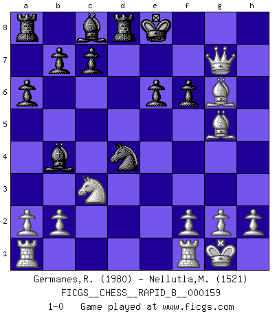 Last move : 1-0 2010 October 4 11:55:1 [Event "FICGS__CHESS__RAPID_B__000159"] [Site "FICGS"] [Date "2010.09.02"] [Round "1"] [White "Germanes,Ramil"] [Black "Nellutla,Manobhiram"] [Result "1-0"] [WhiteElo "1980"] [BlackElo "1521"] 1.d4 d5 2.c4 dxc4 3.Nf3 e6 4.e3 c3 5.Nxc3 a6 6.Bd3 Nf6 7.O-O Bd6 8.e4 O-O 9.e5 Bb4 10.exf6 Qxf6 11.Bg5 Qxf3 12.Qxf3 Nc6 13.Bf4 Nxd4 14.Qe4 Rd8 15.Qxh7+ Kf8 16.Qh8+ Ke7 17.Bg5+ f6 18.Qxg7+ Ke8 19.Bg6+ 1-0 QGA : 3.Nf3 Kingside Castling by player White (move 7) Kingside Castling by player Black (move 8) Player White won this chess game. Follow this game move after move (download)The way he plays Chess demonstrates a man's whole nature. (Stanley Ellin) Konzentriere dich auf materielle Gewinne. Nimm, was dir dein Gegner gibt, ausser es gibt einen guten Grund der dagegenspricht. (Robert James Fischer) Una partida de Ajedrez se divide en 3 etapas: la primera cuando piensas que tienes la ventaja, la segunda cuando crees que tienes la ventaja y la tercera... ¡cuando te das cuenta que vas a perder!. (Savielly Tartakower) Comme les marins qui ont mille raisons différentes d'aller en mer, les joueurs d'échecs en ont tout autant avant de s'installer devant une table et jouer... (Vincent Bertignac, philosophe) You know what they say : You lie down with the Devil, you wake up in Hell. (Horatio Caine, C.S.I. Miami)