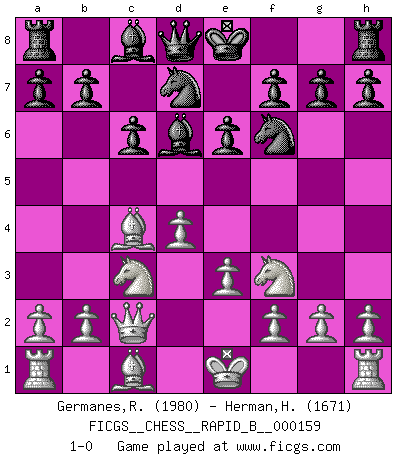 Last move : 1-0 2010 October 10 21:40:38 [Event "FICGS__CHESS__RAPID_B__000159"] [Site "FICGS"] [Date "2010.09.02"] [Round "1"] [White "Germanes,Ramil"] [Black "Herman,Herdiansyah"] [Result "1-0"] [WhiteElo "1980"] [BlackElo "1671"] 1.d4 d5 2.c4 c6 3.Nf3 Nf6 4.Nc3 e6 5.e3 Nbd7 6.Qc2 Bd6 7.Bd3 dxc4 8.Bxc4 1-0 This chess game has been lost on time (started : 2010.09.02 0:50:6) QGD Slav : 4.Nc3 Player White won this chess game. Follow this game move after move (download)Chess is life. (Bobby Fischer) Glücklicherweise sind Großmeister Ruben Fines reine Schachbücher weniger phallozentrisch [als seine Schachpsychologie] und deswegen auch weniger lächerlich. (Nigel Short) Yo nunca en mi vida he jugado la Defensa Francesa, que viene siendo la más aburrida de todas las Aperturas. (Wilhelm Steinitz) Shah mat. Le roi est mort. Cri de fierté d'un joueur venant de terrasser son adversaire, courtoisement, sans effusion de sang. Knowledge rests not upon truth alone, but upon error also. (Carl G. Jung)