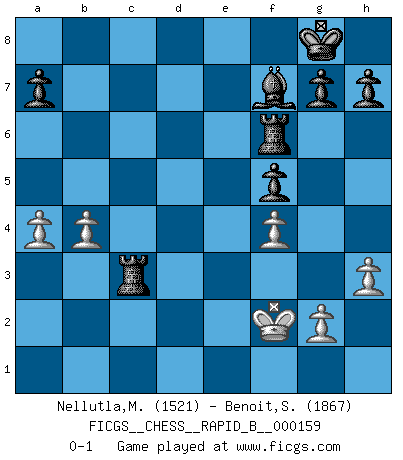 Last move : 0-1 2010 October 25 13:47:5 [Event "FICGS__CHESS__RAPID_B__000159"] [Site "FICGS"] [Date "2010.09.02"] [Round "1"] [White "Nellutla,Manobhiram"] [Black "Benoit,Sebastien"] [Result "0-1"] [WhiteElo "1521"] [BlackElo "1867"] 1.d4 Nf6 2.e3 e6 3.a3 d5 4.h3 c5 5.dxc5 Bxc5 6.Nc3 O-O 7.Bd3 e5 8.Nge2 Be6 9.O-O Nc6 10.Ng3 e4 11.Bb5 Bd6 12.Bxc6 bxc6 13.Nh5 Nxh5 14.Qxh5 f5 15.Bd2 Rf6 16.f4 c5 17.Rad1 Bf7 18.Qh4 d4 19.exd4 cxd4 20.Nb5 Qb6 21.a4 e3 22.Nxd4 e2 23.Rde1 exf1Q+ 24.Rxf1 Qxd4+ 25.Qf2 Bc5 26.Be3 Qxe3 27.b4 Qxf2+ 28.Rxf2 Bxf2+ 29.Kxf2 Rc8 30.c3 Rxc3 0-1 Queen's pawn game Kingside Castling by player Black (move 6) Kingside Castling by player White (move 9) Promotion Queen by player Black (move 23) Player Black won this chess game. Follow this game move after move (download)A strong memory, concentration, imagination, and a strong will is required to become a great Chess player. (Bobby Fischer) Vielleicht wirkt die Aura früherer Spieler glanzvoller als die der heutigen Spieler, aber das liegt daran, dass man kein Programm wie Fritz hatte, das einem all die Löcher in ihren Partien zeigt. (Vladimir Kramnik) Puntos débiles o agujeros en la posición de tu oponente deben de ser ocupados por piezas, no Peones. (Siegbert Tarrasch) On peut tirer plus d'utilité d'une partie perdue que de 100 parties gagnées. (Capablanca) Without deviation from the norm, progress is not possible. (Frank Zappa)