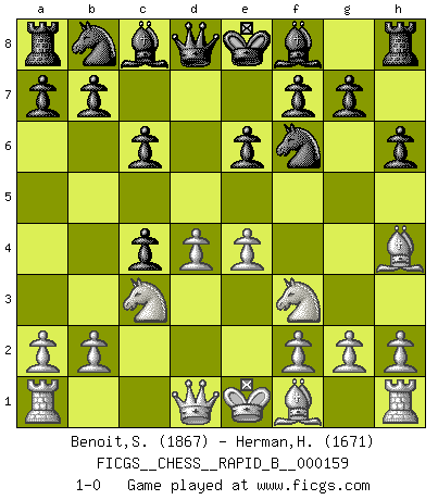 Last move : 1-0 2010 October 9 21:31:5 [Event "FICGS__CHESS__RAPID_B__000159"] [Site "FICGS"] [Date "2010.09.02"] [Round "1"] [White "Benoit,Sebastien"] [Black "Herman,Herdiansyah"] [Result "1-0"] [WhiteElo "1867"] [BlackElo "1671"] 1.d4 d5 2.c4 c6 3.Nf3 Nf6 4.Nc3 e6 5.Bg5 h6 6.Bh4 dxc4 7.e4 1-0 This chess game has been lost on time (started : 2010.09.02 0:50:6) QGD Slav : 4.Nc3 Player White won this chess game. Follow this game move after move (download)When you see a good move, look for a better one. (Emanuel Lasker) Schach ist das schnellste Spiel der Welt, weil man in jeder Sekunde Tausende von Gedanken ordnen muß. (Albert Einstein) Muchos se han convertido en Maestros de Ajedrez, nadie se ha convertido en el Maestro del Ajedrez. (Siegbert Tarrasch) La vie et les Echecs sont tous les deux une lutte constante. (Lasker) That's absurd. I love it. (Gregory House, House M.D.)