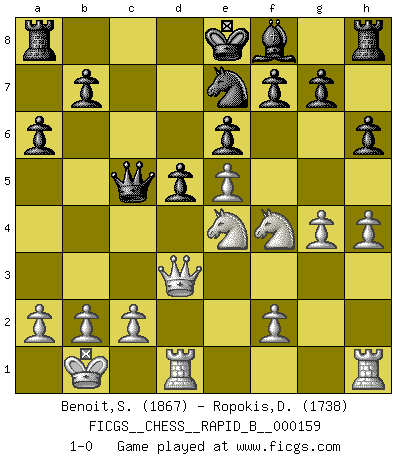 Last move : 1-0 2010 September 4 14:35:8 [Event "FICGS__CHESS__RAPID_B__000159"] [Site "FICGS"] [Date "2010.09.02"] [Round "1"] [White "Benoit,Sebastien"] [Black "Ropokis,Dimitrios"] [Result "1-0"] [WhiteElo "1867"] [BlackElo "1738"] 1.e4 c6 2.d4 d5 3.e5 Bf5 4.Nc3 e6 5.g4 Bg6 6.Nge2 h6 7.Nf4 Bh7 8.Be3 Ne7 9.Bd3 Bxd3 10.Qxd3 Nd7 11.O-O-O a6 12.h4 Qc7 13.Kb1 c5 14.dxc5 Nxc5 15.Bxc5 Qxc5 16.Ne4 1-0 Caro-Kann : Advance variation Queenside Castling by player White (move 11) Player White won this chess game. Follow this game move after move (download)Discovered check is the dive bomber of the Chessboard. (Reuben Fine) Wenn Spassky eine Figur opfert kannst du genauso gut aufgeben. Aber wenn Tal eine Figur opfert, spiel weiter. Er könnte noch eine weitere opfern, und dann ... wer weiß? (Miguel Najdorf) La batalla por la última verdad nunca sera ganada. Y es por eso que el Ajedrez es tan fascinante. (Hans Kmoch) On n'a jamais que l'âge auquel on a commence à jouer aux échecs car après on cesse de vieillir. (Capablanca) I feel so... helpless. (C-3PO in Star Wars ep.3)