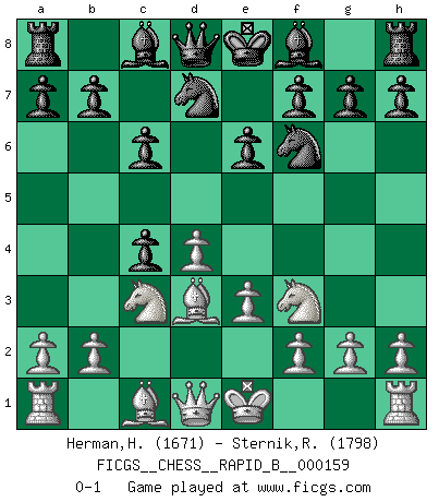 Last move : 0-1 2010 October 9 9:31:15 [Event "FICGS__CHESS__RAPID_B__000159"] [Site "FICGS"] [Date "2010.09.02"] [Round "1"] [White "Herman,Herdiansyah"] [Black "Sternik,Ryszard"] [Result "0-1"] [WhiteElo "1671"] [BlackElo "1798"] 1.d4 d5 2.c4 c6 3.Nc3 Nf6 4.Nf3 e6 5.e3 Nbd7 6.Bd3 dxc4 0-1 This chess game has been lost on time (started : 2010.09.02 0:50:6) QGD Slav defense Player Black won this chess game. Follow this game move after move (download)Chess makes man wiser and clear-sighted. (Vladimir Putin) Um dein Spiel zu verbessern musst du zuallererst das Endspiel studieren, denn diese kann unabhängig studiert werden. Die Eröffnung und das Mittelspiel müssen immer in Bezug gesetzt werden zum Endspiel. (José Raúl Capablanca) Robert Fischer es la ley hacia si mismo. (Larry Evans) Botvinnik disait en comparant les échecs à la musique: Il existe une science dont le but est l'étude de l'acoustique et des sons. Mais il y a aussi un art qui se sert de l'océan des sons : c'est la musique. De toute évidence, il en est de même pour la pensée. La logique est l'étude des lois de la réflexion et les échecs reflètent, en tant qu'art, le côté logique de la réflexion, sous la forme d'images artistiques... Extrait de Fischer - Spassky, Reykjavik 1972 par Alexander & F. Wyndham (Ed. Solar), p 37. When it is a question of money, everybody is of the same religion. (Voltaire)