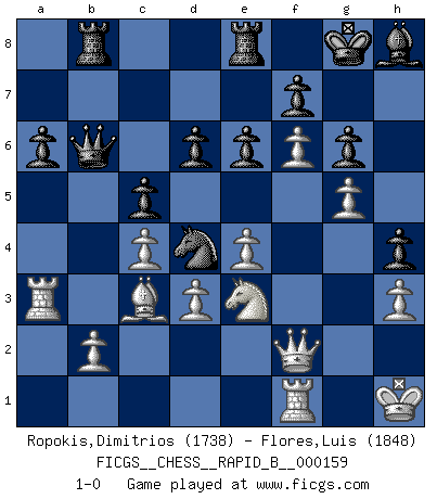 Last move : 1-0 2010 October 18 11:48:12 [Event "FICGS__CHESS__RAPID_B__000159"] [Site "FICGS"] [Date "2010.09.02"] [Round "1"] [White "Ropokis,Dimitrios"] [Black "Flores,Luis"] [Result "1-0"] [WhiteElo "1738"] [BlackElo "1848"] 1.e4 c5 2.Nc3 Nc6 3.f4 g6 4.Nf3 Bg7 5.Bb5 Nd4 6.O-O Nxb5 7.Nxb5 d6 8.d3 Nf6 9.c4 O-O 10.Nc3 a6 11.Qe2 Be6 12.a4 Qc7 13.a5 Bg4 14.h3 Bxf3 15.Qxf3 e6 16.f5 Nd7 17.Kh1 Bd4 18.Ne2 Bg7 19.Nc3 Ne5 20.Qg3 Nc6 21.f6 Bh8 22.Bd2 Rac8 23.Nd1 Nd4 24.Ra3 h5 25.Ne3 Rb8 26.Qf2 b5 27.axb6 Qxb6 28.Bc3 Rfe8 29.g4 h4 30.g5 1-0 Sicilian : Grand Prix attack Kingside Castling by player White (move 6) Kingside Castling by player Black (move 9) Player White won this chess game. Follow this game move after move (download)The hardest game to win is a won game. (Emanuel Lasker) Ich bin der einzige Schachspieler, der sich während der Vorbereitungen zum Turnier verletzt hat. (Woody Allen) Una clavada es mas poderosa que una espada. (Fred Reinfeld) Comme les marins qui ont mille raisons différentes d'aller en mer, les joueurs d'échecs en ont tout autant avant de s'installer devant une table et jouer... (Vincent Bertignac, philosophe) The problem with manipulation is that people can turn on you. (Horatio Caine, C.S.I. Miami)
