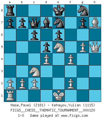 Last move : 1-0 2010 September 19 11:47:4 [Event "FICGS__CHESS__THEMATIC_TOURNAMENT__000120"] [Site "FICGS"] [Date "2010.09.02"] [Round "1"] [White "Hase,Pavel"] [Black "Kehayov,Yulian"] [Result "1-0"] [WhiteElo "2181"] [BlackElo "1115"] 1.d4 f5 2.g4 fxg4 3.Bf4 Nf6 4.h3 e6 5.hxg4 d5 6.e3 Nc6 7.Bd3 Bd6 8.Nc3 Bxf4 9.exf4 Bd7 10.g5 Ng8 11.Rxh7 Rxh7 12.Bxh7 Nce7 13.Nf3 c6 14.Ne5 Qc7 15.Qh5+ 1-0 Dutch, Krejcik gambit Player White won this chess game. Follow this game move after move (download)My opponents make good moves too. Sometimes I don't take these things into consideration. (Bobby Fischer) Mit sehr nachdenklichem Gesicht schreitet Bobby durch den Turniersaal. Was ist passiert?, fragt Lombardy. Ich stehe schlecht, antwortet Fischer. Lombardy: Dann biete doch einfach Remis an. Fischer: So schlecht stehe ich nun auch wieder nicht! (Robert James Fischer) La táctica fluye a partir de una posición superior. (Bobby Fischer) J'apprécie les joueurs d'est-indienne, c'est grâce à eux que je nourris ma famille depuis tant d'années. (Petrosian) I'll be back. (Arnold Schwarzenegger)