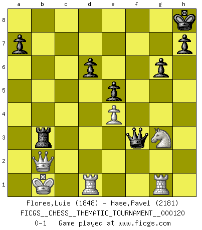 Last move : 0-1 2010 November 2 10:19:29 [Event "FICGS__CHESS__THEMATIC_TOURNAMENT__000120"] [Site "FICGS"] [Date "2010.09.02"] [Round "1"] [White "Flores,Luis"] [Black "Hase,Pavel"] [Result "0-1"] [WhiteElo "1848"] [BlackElo "2181"] 1.d4 f5 2.g4 fxg4 3.e4 d6 4.h3 Nf6 5.Nc3 e5 6.d5 Be7 7.hxg4 Bxg4 8.f3 Bh5 9.Be3 O-O 10.Qd3 c6 11.O-O-O cxd5 12.Nxd5 Nxd5 13.Qxd5+ Bf7 14.Qxb7 Nd7 15.Ne2 Rb8 16.Qa6 Bg5 17.Bxg5 Qxg5+ 18.Kb1 Nc5 19.Qa3 Rb6 20.Rg1 Qf6 21.Ng3 Rfb8 22.b3 Kh8 23.Bd3 Bxb3 24.cxb3 Qxf3 25.Bc4 Nxb3 26.Bxb3 Rxb3+ 27.axb3 Rxb3+ 28.Qb2 g6 0-1 Dutch, Krejcik gambit Kingside Castling by player Black (move 9) Queenside Castling by player White (move 11) Player Black won this chess game. Follow this game move after move (download)After a bad opening, there is hope for the middle game. After a bad middle game, there is hope for the endgame. But once you are in the endgame, the moment of truth has arrived. (Edmar Mednis) Zu meiner Zeit war ein 20 jähriger ein junger Spieler, heute ist er ein Veteran. (Garry Kasparov) Un jugador que trata de regresar una movida en el Ajedrez es un futuro carterista. (Richard Fenton) Mais n'est-ce pas déjà le limiter injurieusement que d'appeler les échecs un jeu? N'est-ce pas aussi une science, un art, ou quelque chose qui, comme le cercueil de Mahomet entre ciel et terre, est suspendu entre l'un et l'autre, et qui réunit un nombre incroyable de contraires ? (Stefan Zweig) Creativity involves breaking out of established patterns in order to look at things in a different way. (Edward De Bono)