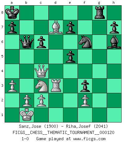 Last move : 1-0 2010 October 3 15:25:35 [Event "FICGS__CHESS__THEMATIC_TOURNAMENT__000120"] [Site "FICGS"] [Date "2010.09.02"] [Round "1"] [White "Sanz,Jose"] [Black "Riha,Josef"] [Result "1-0"] [WhiteElo "1900"] [BlackElo "2041"] 1.d4 f5 2.g4 fxg4 3.h3 d6 4.Nc3 Nf6 5.hxg4 Bxg4 6.Nf3 Rg8 7.Qd3 Nc6 8.d5 Bxf3 9.exf3 Ne5 10.Qe2 c6 11.Be3 g5 12.O-O-O Qa5 13.Bd4 O-O-O 14.Bh3+ Kb8 15.Bxe5 dxe5 16.dxc6 bxc6 17.Rxd8+ Qxd8 18.Rd1 Qa5 19.Qc4 Bh6 20.Bg4 Qb6 21.Rd3 Ka8 22.Bd7 g4 23.Kb1 gxf3 24.a3 1-0 Dutch, Krejcik gambit Queenside Castling by player White (move 12) Queenside Castling by player Black (move 13) Player White won this chess game. Follow this game move after move (download)Fischer wanted to give the Russians a taste of their own medicine. (Larry Evans) Offener Brief an US-Präsident Bush anlässlich der Verhaftung Bobby Fishers: Verhaften Sie mich. Stecken Sie mich in dieselbe Zelle wie Bobby Fisher und geben Sie uns ein Schachspiel mit. (Boris Vassilievich Spassky) Una partida de Ajedrez se divide en 3 etapas: la primera cuando piensas que tienes la ventaja, la segunda cuando crees que tienes la ventaja y la tercera... ¡cuando te das cuenta que vas a perder!. (Savielly Tartakower) Les échecs, c'est la lutte contre l'erreur. (Johannes Zukertort) At work, the authority of a person is inversely proportional to the number of pens that person is carrying. (Dan Rotaru)